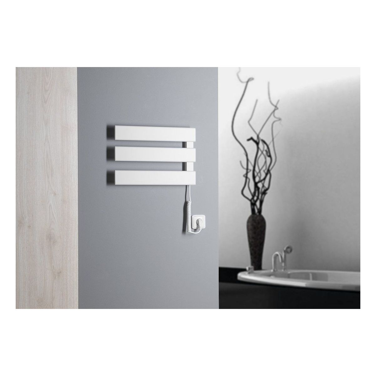 Le séchoir permet de chauffer et de sécher les serviettes, ce qui est particulièrement apprécié en hiver. Le corps est en acier inoxydable, ce qui garantit une longue durée de vie. Vous apprécierez la forme en E du corps, pratique pour ranger les serviettes, et sa taille compacte, surtout dans les petites salles de bains. Le chauffage est assuré par un câble chauffant résistif en fibre de carbone (il n'est pas nécessaire de le remplir de liquide), qui garantit une excellente conductivité thermique. Le boîtier peut être raccordé directement à une prise électrique à l'aide d'un câble se terminant par une fiche.