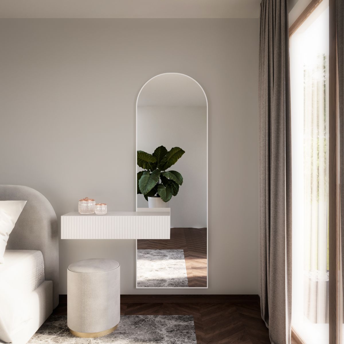 Le miroir confère à la pièce une atmosphère extrêmement chaleureuse, voire intime, agrémentée d'un soupçon de modernité. Il s'agit d'un produit haut de gamme, fabriqué en Pologne. Il allie à la fois style et fonctionnalité. La surface du miroir est entourée d'un cadre minimaliste disponible en quatre couleurs : blanc, noir, argent et or. Disponible en plusieurs tailles.