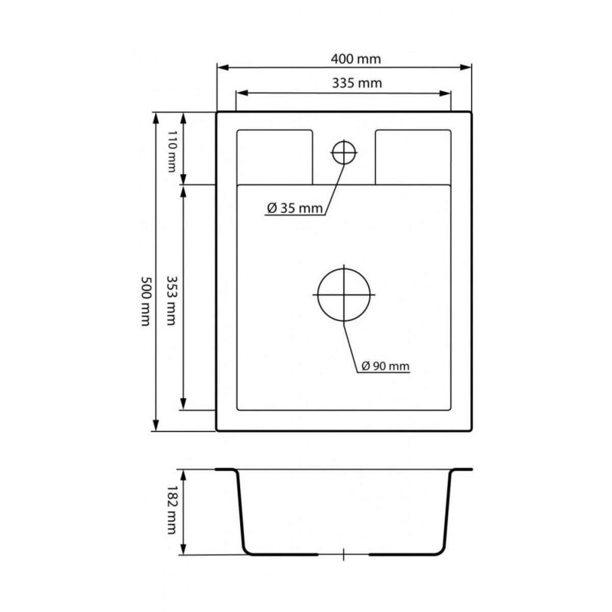 L'évier a des dimensions compactes de 400x500 mm et une cuve profonde de 180 mm, ce qui garantit une utilisation confortable même dans les petits espaces de cuisine.