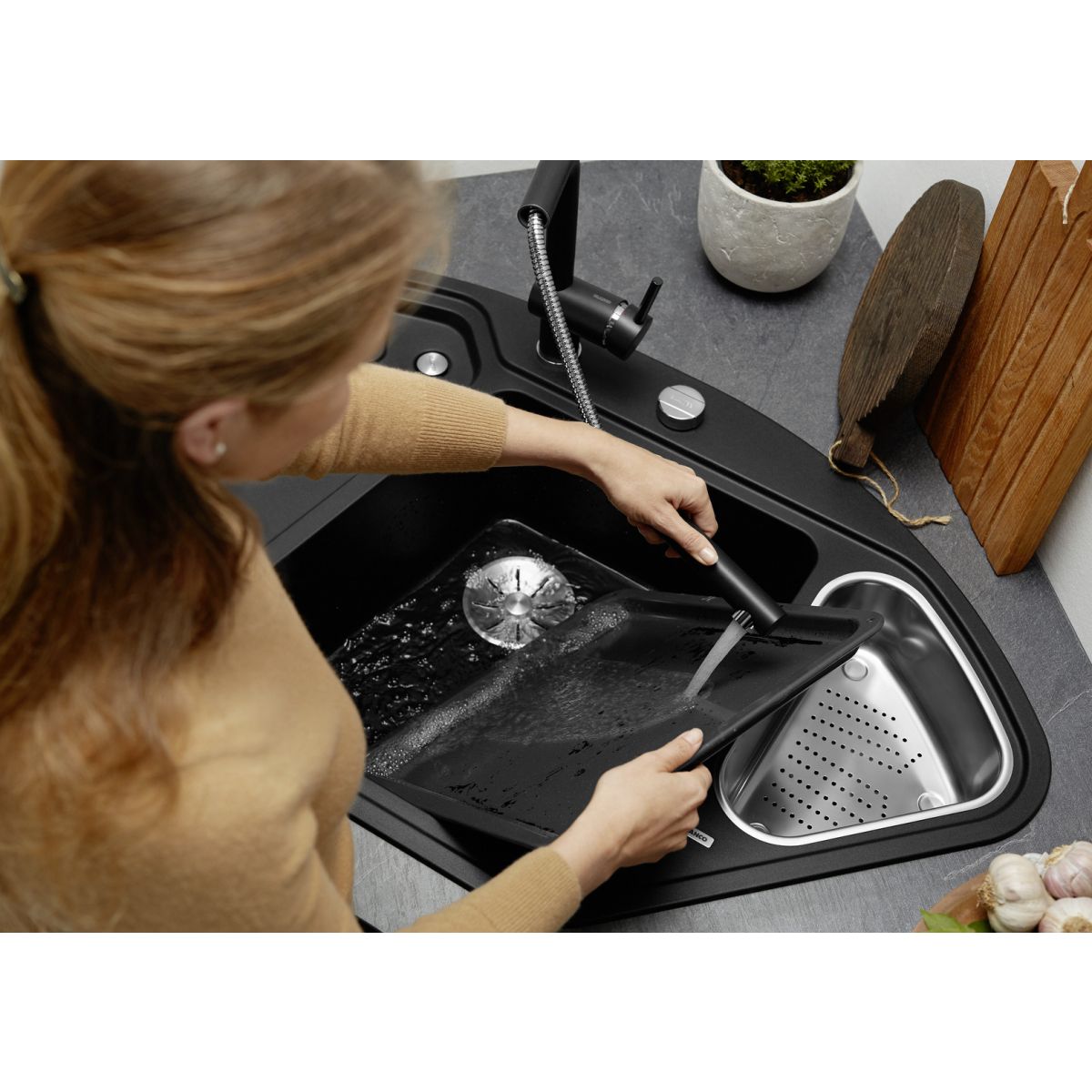 - le matériau (Silgranit) est composé à 80 % de granit naturel combiné à de la céramique, de l'acrylique et des pigments colorés pour des propriétés uniques et un bel aspect