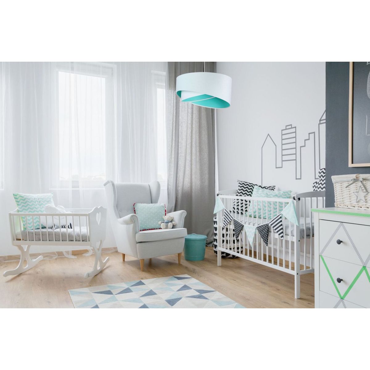 Abat-jour en tissu (microphase) sur plastique PVC avec centre menthe. Paramètres du luminaire : 1 x E27 max 60 W. Paramètres de la lampe frontale : plastique, 10 cm x 2 cm. Longueur du câble : max 80 cm, réglable. Couleur du câble : transparent. Possibilité d'utiliser des ampoules LED.