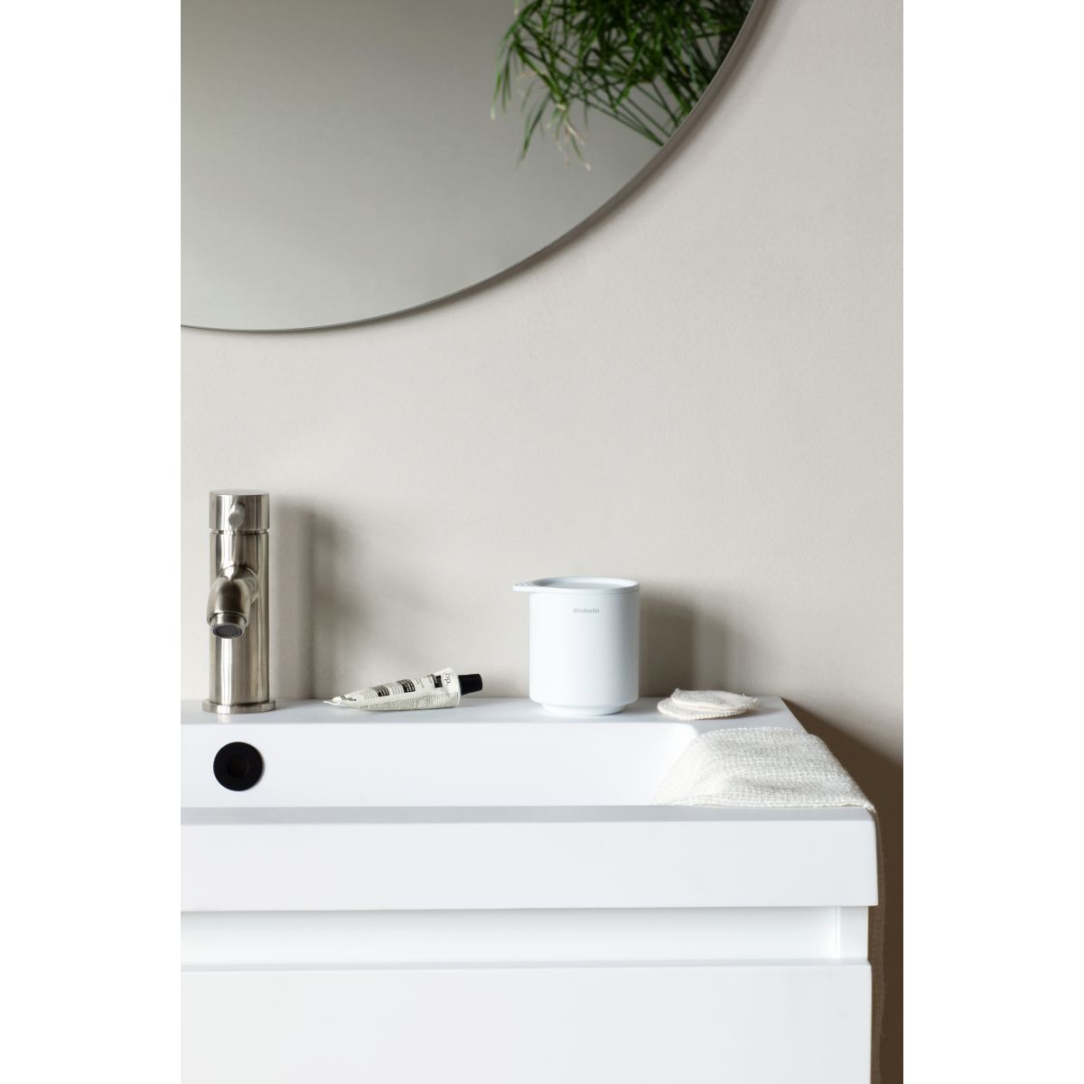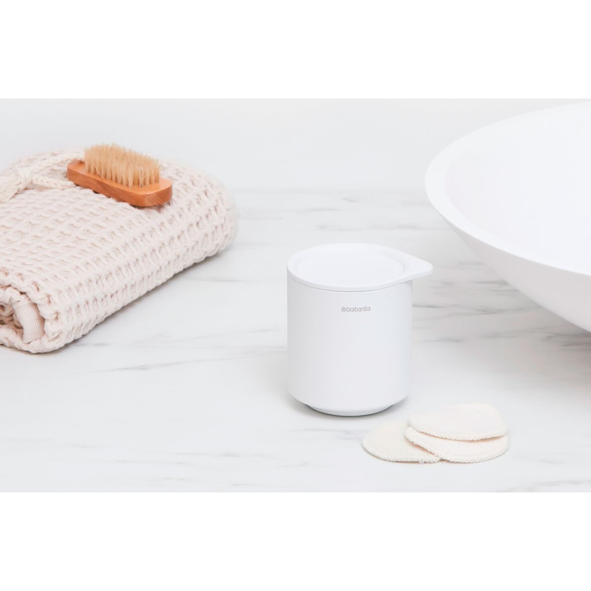 Ce sont les petites choses qui nous plaisent. Comme, par exemple, ce joli récipient MindSet avec couvercle de Brabantia. Il s'agit d'un joli récipient en métal texturé pour toutes les petites choses que vous souhaitez conserver au même endroit. Il est idéal pour les bâtonnets auriculaires ou les cotons-tiges, qui restent au sec et à l'abri de la poussière grâce au couvercle doux au toucher. Le récipient idéal.