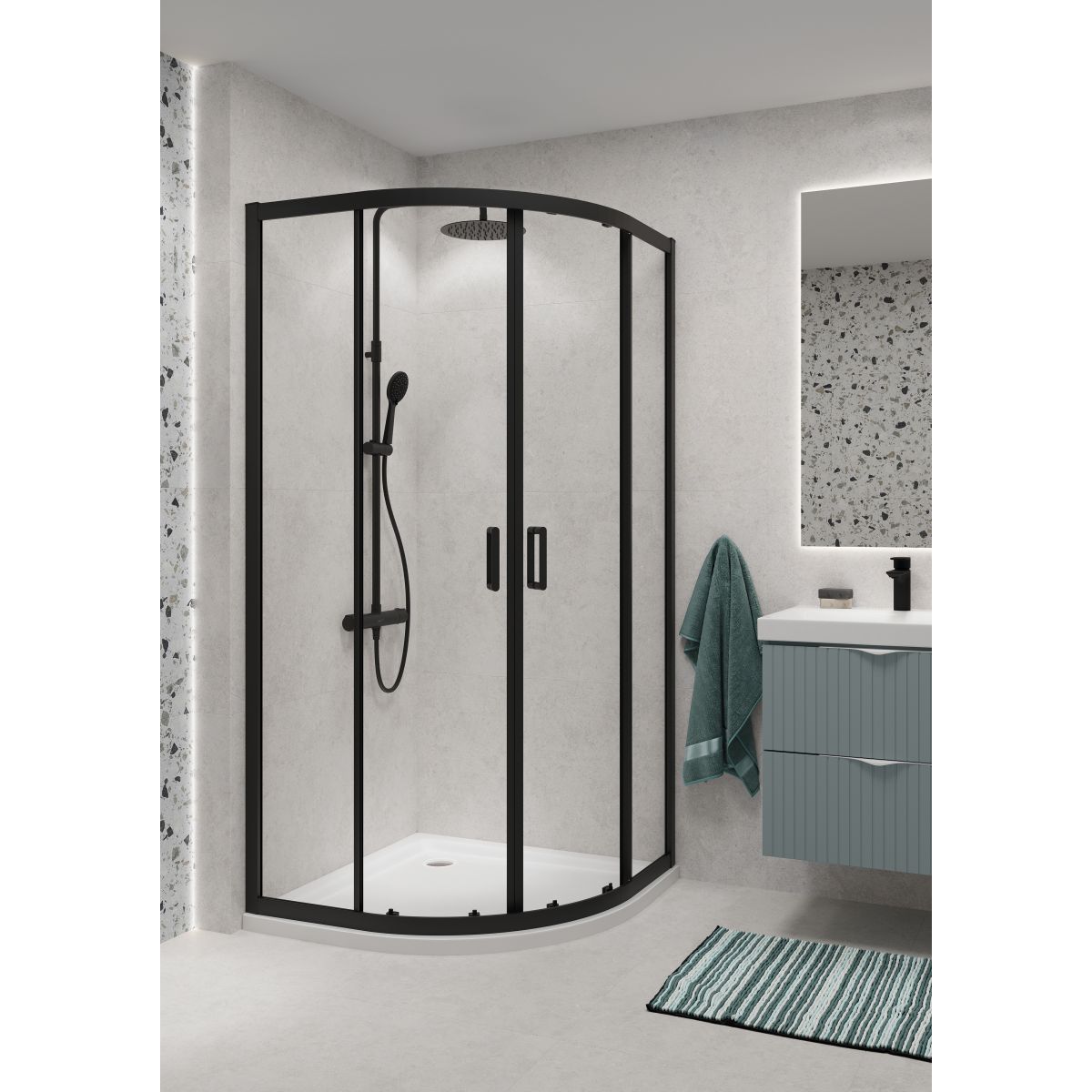La cabine de douche ARTECO est fabriquée en verre de sécurité trempé de 5 mm d'épaisseur, ce qui assure la stabilité de la structure et garantit la sécurité d'utilisation. Le verre est équipé d'un revêtement hydrophobe CleanPro qui empêche efficacement les dépôts de calcaire et de saleté, ce qui facilite la propreté de la cabine. La cabine de douche est équipée d'un système de porte coulissante à double galets chromés en haut et en bas, qui assure une ouverture et une fermeture en douceur de la porte. La fonction d'ouverture rapide des roulettes inférieures permet de retirer facilement la porte de la cabine. La cabine de douche est également équipée d'un profilé mural fonctionnel qui s'adapte aux irrégularités du mur jusqu'à 15 mm. Les poignées double face en métal de haute qualité allient durabilité et fonctionnalité. Cabine d'angle semi-circulaire, hauteur 190 cm, largeur 80 cm, avec verre transparent. Profilés noirs. La cabine est conçue pour être installée avec un receveur de douche ou directement sur le sol. Une large gamme d'écoulements et de receveurs de douche de différentes couleurs et hauteurs est disponible pour compléter la cabine de douche, ce qui permet une grande flexibilité de configuration. La haute qualité du produit est confirmée par une garantie de longue durée.