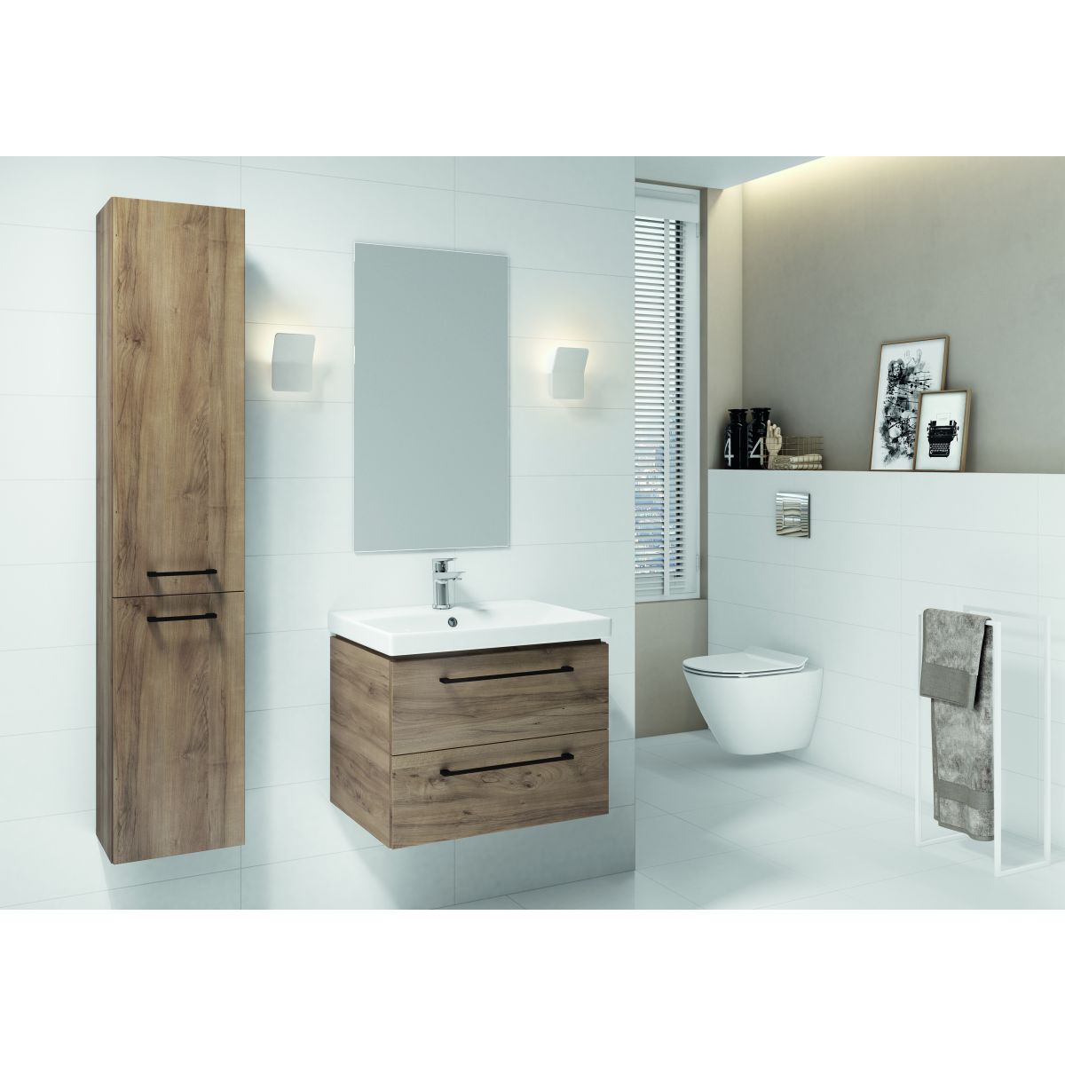 Le caisson Gala est fabriqué en aggloméré stratifié de couleur noyer. Il s'agit d'un caisson de salle de bains d'excellente qualité, au design moderne et à la finition soignée. La gamme de meubles de salle de bains Gala se caractérise par son design moderne et minimaliste. Les meubles en noyer et les poignées en noir confèrent style et élégance à toute salle de bains. L'avantage pratique d'une telle finition est la facilité de nettoyage. Le meuble est doté d'armoires spacieuses avec des portes - avec une fonction de fermeture silencieuse. Meuble à monter soi-même. L'assemblage des portes est universel.