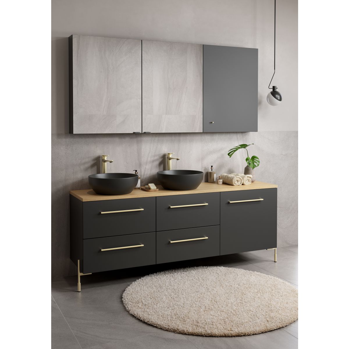 Meuble de salle de bains de la collection Larga en anthracite au format 100. La façade et le corps sont en panneaux de particules de haute qualité, laqués dans une élégante couleur anthracite. Le meuble est équipé de deux tiroirs spacieux qui offrent beaucoup d'espace pour ranger les produits cosmétiques, les serviettes et les accessoires de salle de bains. L'intérieur des tiroirs est d'un gris élégant, qui s'harmonise avec la façade anthracite, créant ainsi un ensemble esthétiquement cohérent. Le système soft close permet aux tiroirs de se fermer doucement et silencieusement, augmentant ainsi le confort d'utilisation. Un élément caractéristique du meuble est la poignée fraisée, qui souligne son style minimaliste. Cette poignée est disponible en trois couleurs - argent, or et noir - ce qui vous permet de personnaliser le meuble et de l'assortir à d'autres éléments de l'ameublement de votre salle de bains. La poignée doit être achetée séparément. Le panneau à partir duquel le meuble est fabriqué est certifié par FSC MIX CREDIT SGSCH-COC-007574.