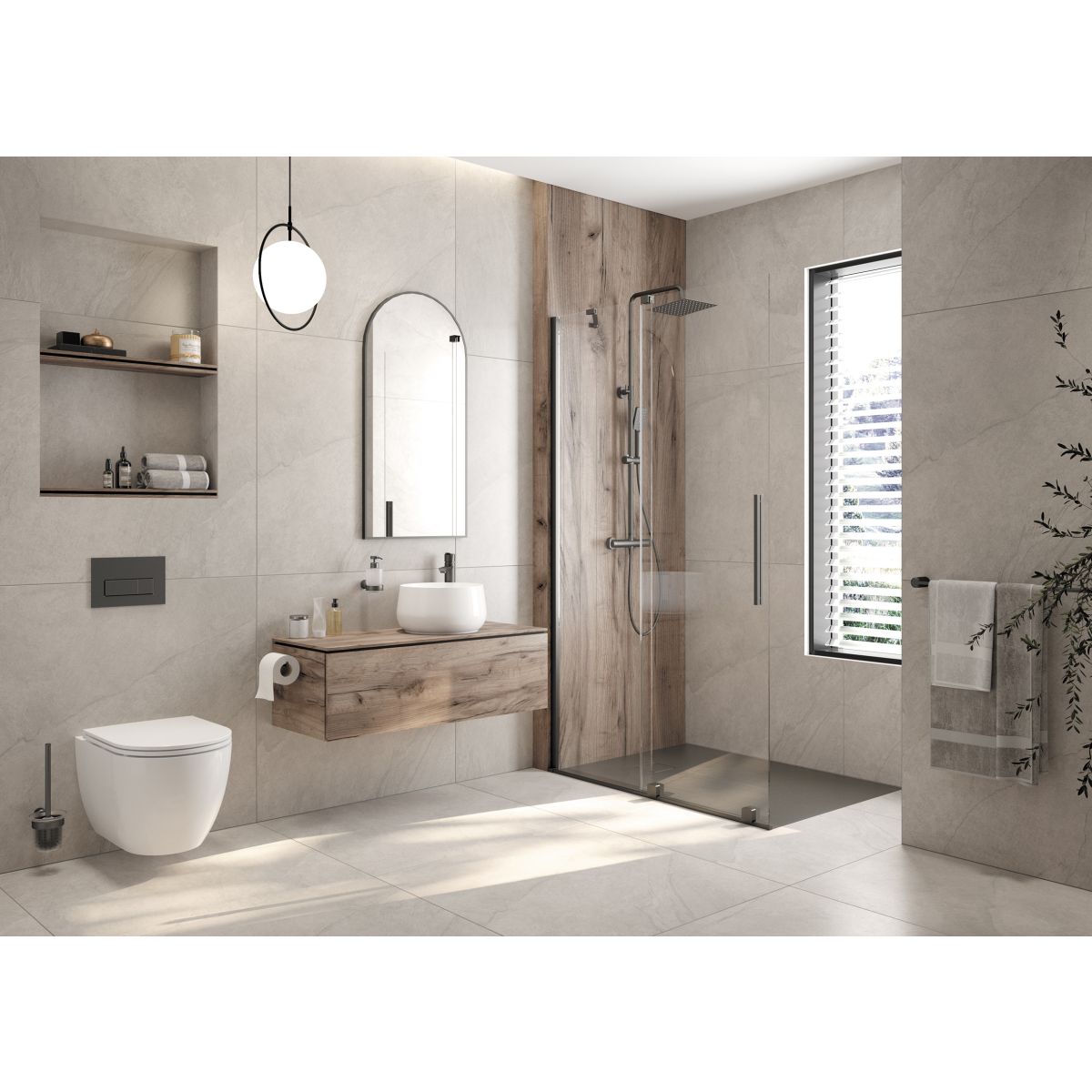 Le receveur de douche en granit Correo est la solution idéale pour les amateurs d'intérieurs modernes. Il est fabriqué en composite de granit durable et enrichi d'ions d'argent antiseptiques. Il peut être installé de trois façons : au niveau du sol, directement sur la chape ou sur un support en matériau de construction. Sa finition anthracite originale s'harmonise parfaitement avec les robinets de couleur nero et titanium.