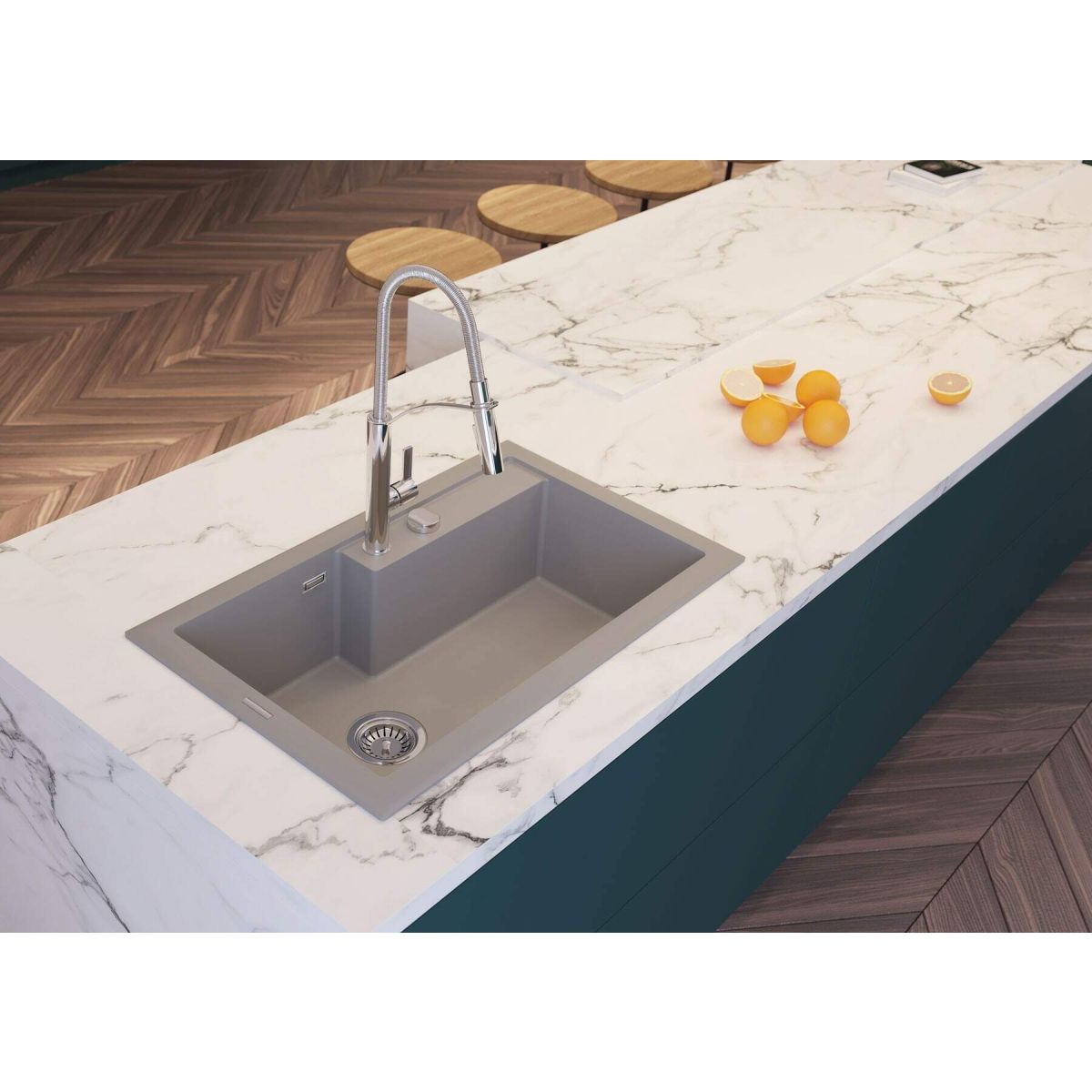 L'évier de cuisine en granit Eridan de Deante avec une cuve animera parfaitement votre intérieur. Il le rendra plus agréable à regarder et plus élégant. Il présente également l'avantage d'une grande qualité et d'une grande durabilité. Le granit contribue au fait que la surface de ce modèle n'est pas facilement affectée par des facteurs externes. Le modèle résiste à la décoloration, aux odeurs, aux impacts, aux températures élevées et aux chocs thermiques. Vous apprécierez également la belle apparence de l'évier grâce à un entretien régulier à l'aide de préparations spécifiques de la gamme Deante. Un bouchon automatique permet d'ouvrir et de fermer la bonde sans avoir à mettre la main à l'intérieur de la cuve. Un trop-plein pratique est prévu dans la cuve et l'ensemble est complété par un siphon peu encombrant dans le meuble Space Saver avec raccordement au lave-vaisselle.