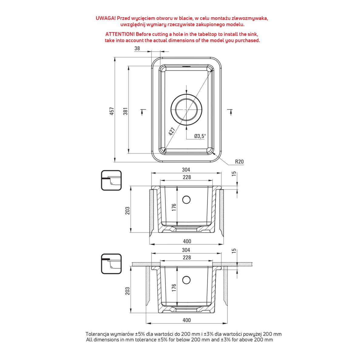 - découpe du plan de travail (suspendu) [mm] : 228 x 381