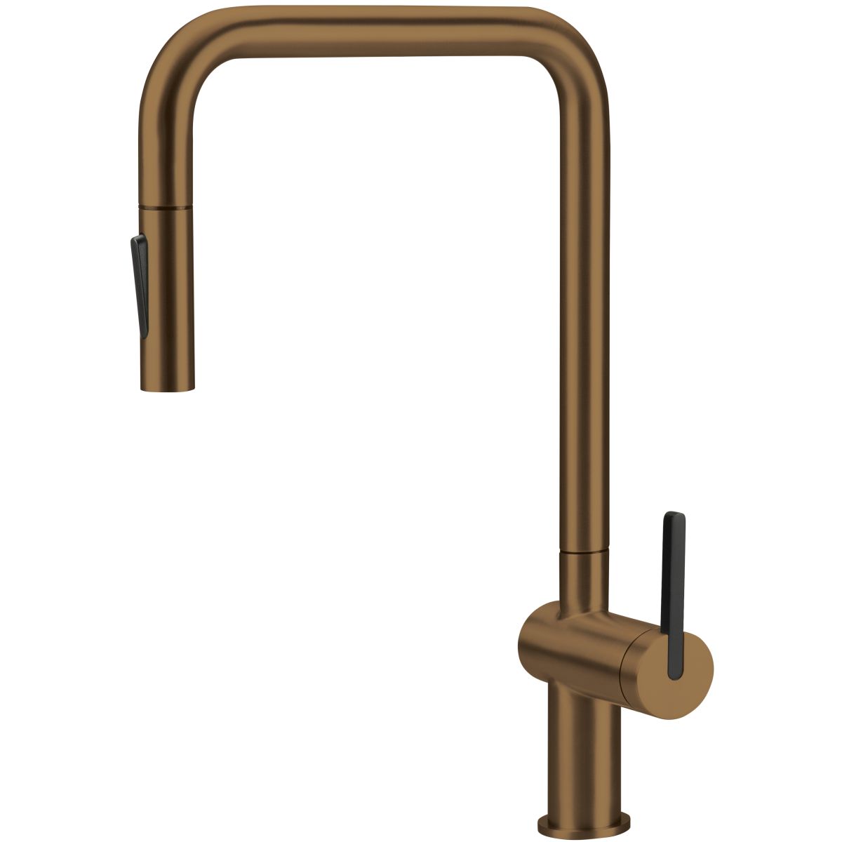 Le mélangeur de cuisine Momi, fabriqué en acier inoxydable durable, se distingue par son bec rectangulaire, qui lui confère une touche d'élégance. Grâce à l'aérateur intégré, l'eau est aérée, ce qui réduit la consommation d'eau. Le bec extractible offre un confort d'utilisation exceptionnel au quotidien, en permettant de manœuvrer l'eau librement lorsque l'on travaille dans l'évier. En outre, le robinet offre deux types de jet : un jet aéré pour le nettoyage quotidien et un jet pluie doux, parfait pour rincer les légumes et les fruits. Fini en bronze brossé mat, le mitigeur Momi s'intègre parfaitement dans un intérieur de cuisine moderne.