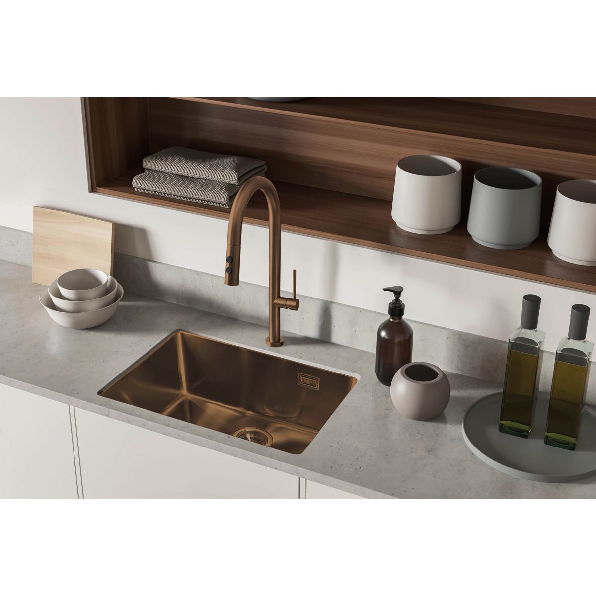 Alliant style et fonctionnalité, la batterie de cuisine Olfato répond parfaitement aux besoins d'une cuisine moderne. Son bec extractible permet de maintenir facilement l'ordre autour de l'évier. La douchette à double fonction, avec jet aéré et jet pluie, offre une grande flexibilité pour les tâches quotidiennes telles que la vaisselle ou le rinçage des fruits et légumes. La finition en bronze brossé apporte chaleur et élégance à la pièce.