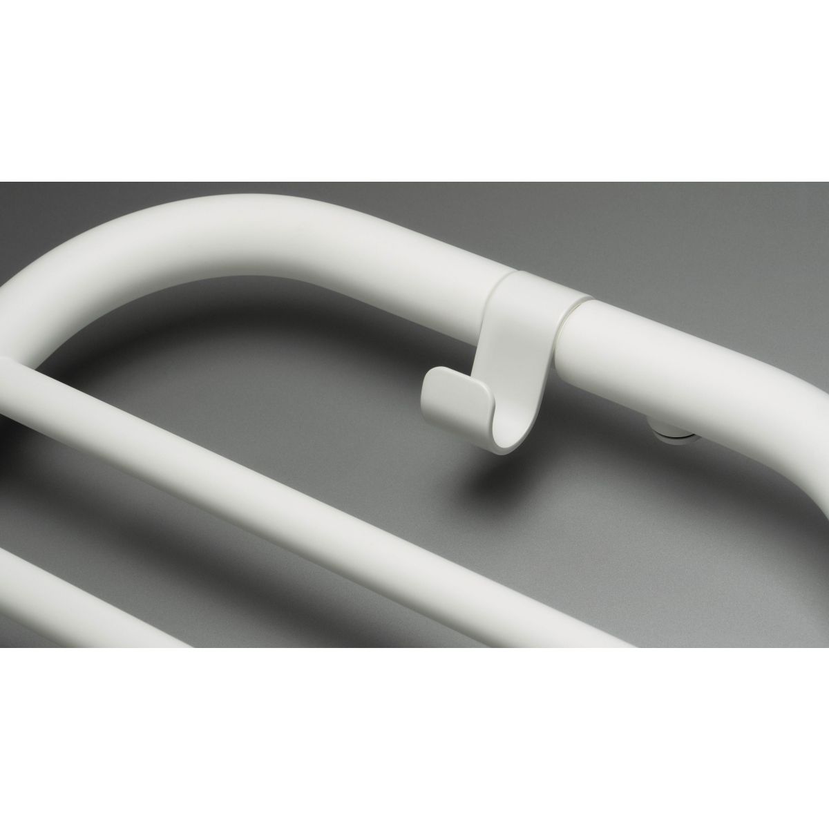 L'élégant radiateur de salle de bains 850x500 présente des lignes douces et une finition blanche unique. Il est équipé d'un crochet pratique pour serviettes ou peignoirs. Il s'agit d'un modèle hybride : eau-électricité, permettant l'installation d'un chauffage optionnel pour fournir de la chaleur supplémentaire ou sécher les serviettes en dehors de la saison de chauffage. Une résistance de 400 W est disponible chez Deante. Une vanne doit être achetée pour le radiateur. Le chauffage optionnel et la vanne nécessaire sont disponibles dans la même couleur que le radiateur.