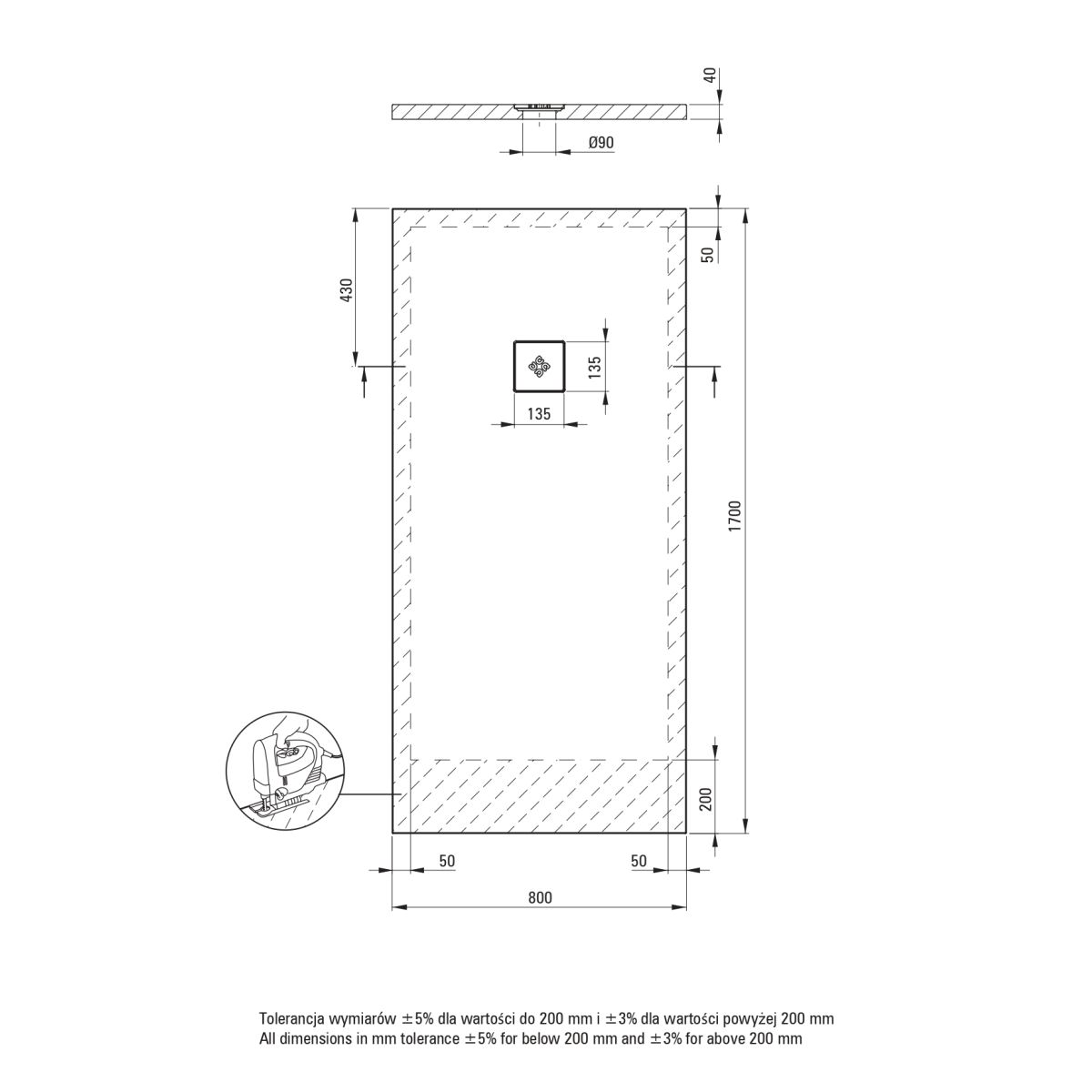 - Technologie SOLID PLUS - remplissage composite, possibilité de couper le receveur de douche dans la zone indiquée sur le dessin