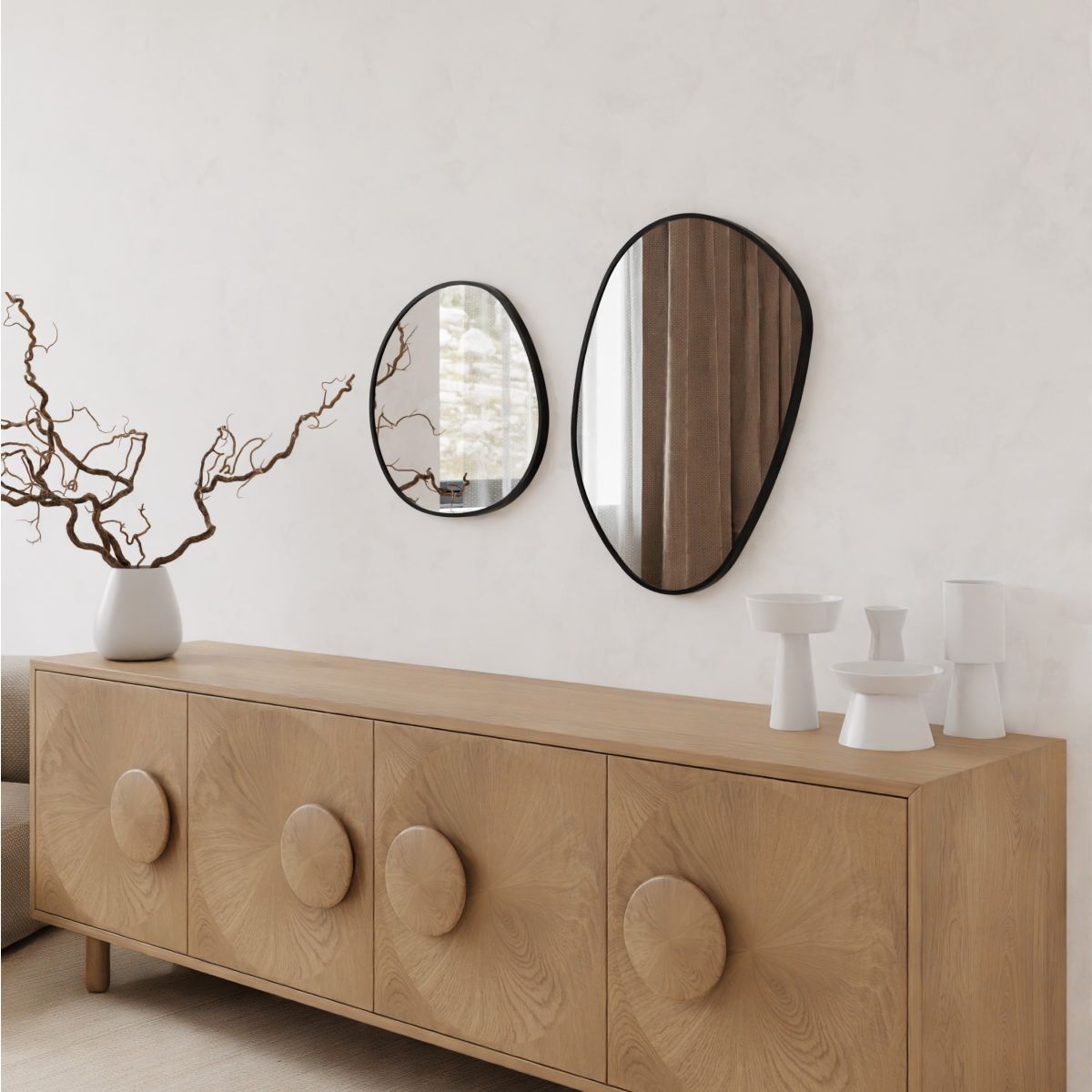 Miroir de forme irrégulière dans un cadre noir en aluminium brossé. Profondeur du cadre : 2,3 cm. Le miroir peut être accroché à la verticale ou à l'horizontale.