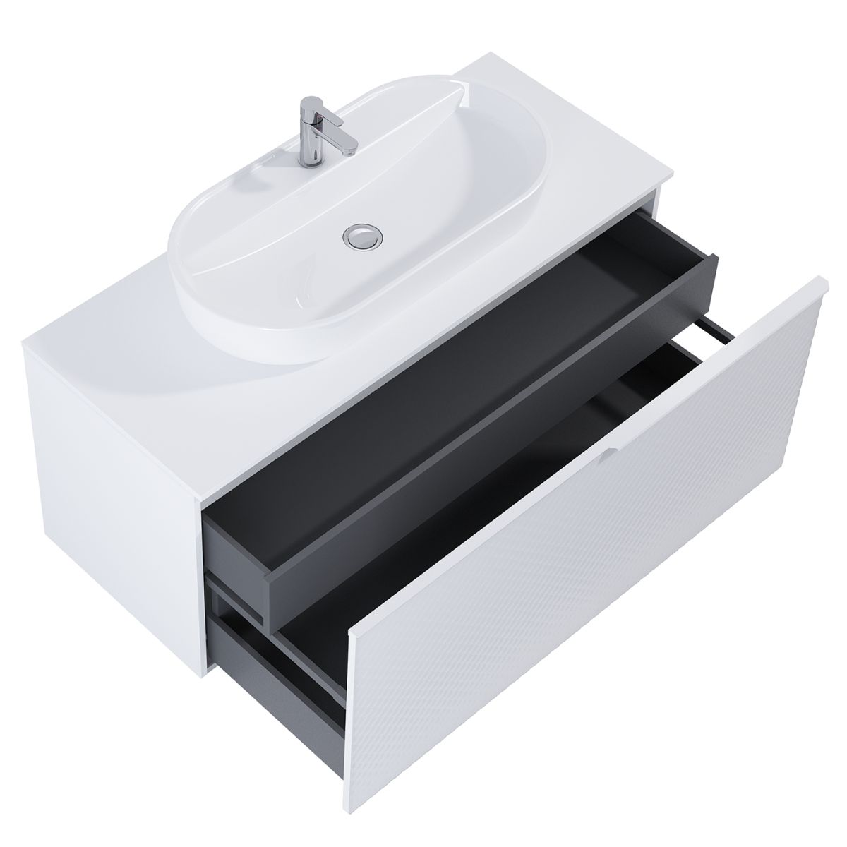 Meuble sous plan Glam 120 cm en blanc mat. Le meuble comporte 2 tiroirs, l'un profond avec des rails de sécurité et l'autre légèrement moins profond, placé juste sous le dessus. Le meuble est fabriqué à partir de matériaux de haute qualité, la façade et le corps étant en panneaux stratifiés. La façade de l'armoire est également enrichie de verre décoratif. Poignée en métal blanc mat. Un siphon peu encombrant est nécessaire pour le bon fonctionnement de l'armoire.