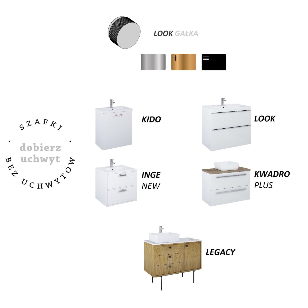 - poignée dédiée aux armoires de la collection : Look, Kido, Inge New, Kwadro Plus, Legacy