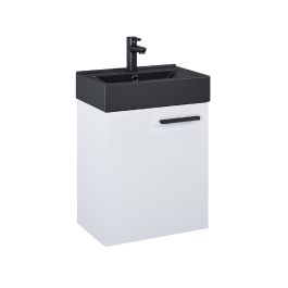 Set Tiny 45 cm, 1 porte, équipé d'une étagère réglable en hauteur. Fabriqué en matériaux résistants à l'humidité, façade et corps en panneau laqué blanc mat, ferrures avec fonction soft-close. Poignées en métal noir mat. L'ensemble se compose d'un lavabo et d'une vasque en noir.
