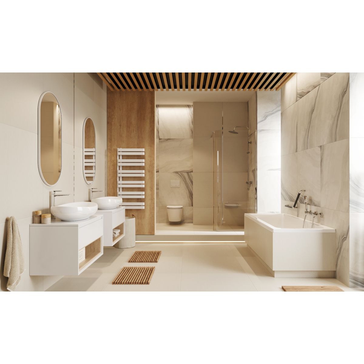 Meteor est une gamme populaire de radiateurs de salle de bains conçue pour répondre aux attentes d'un large éventail de clients. La série populaire de produits avec la disposition en "échelle" a été complétée par une version de radiateurs asymétriques. Le radiateur se distingue par sa forme originale et trouve sa place aussi bien dans les salles de bains classiques que dans les salles de bains modernes. Son design en fait une solution universelle - le radiateur peut être accroché au mur avec des collecteurs verticaux à gauche ou à droite (il suffit de tourner le radiateur). Le radiateur est doté de profils larges et plats, disposés par paires et espacés les uns des autres, ce qui permet d'y accrocher facilement des serviettes. Les profils horizontaux incurvés augmentent considérablement le rendement thermique de ce modèle de radiateur. Le radiateur peut être équipé d'une résistance électrique, ce qui en fait un sèche-serviettes idéal pour toute l'année. Le radiateur est disponible en deux tailles et en deux couleurs : noir doux (RAL 9005) et blanc doux (RAL 9016). En complément des radiateurs Meteor Side, les vannes Excellent et les radiateurs électriques sont recommandés.