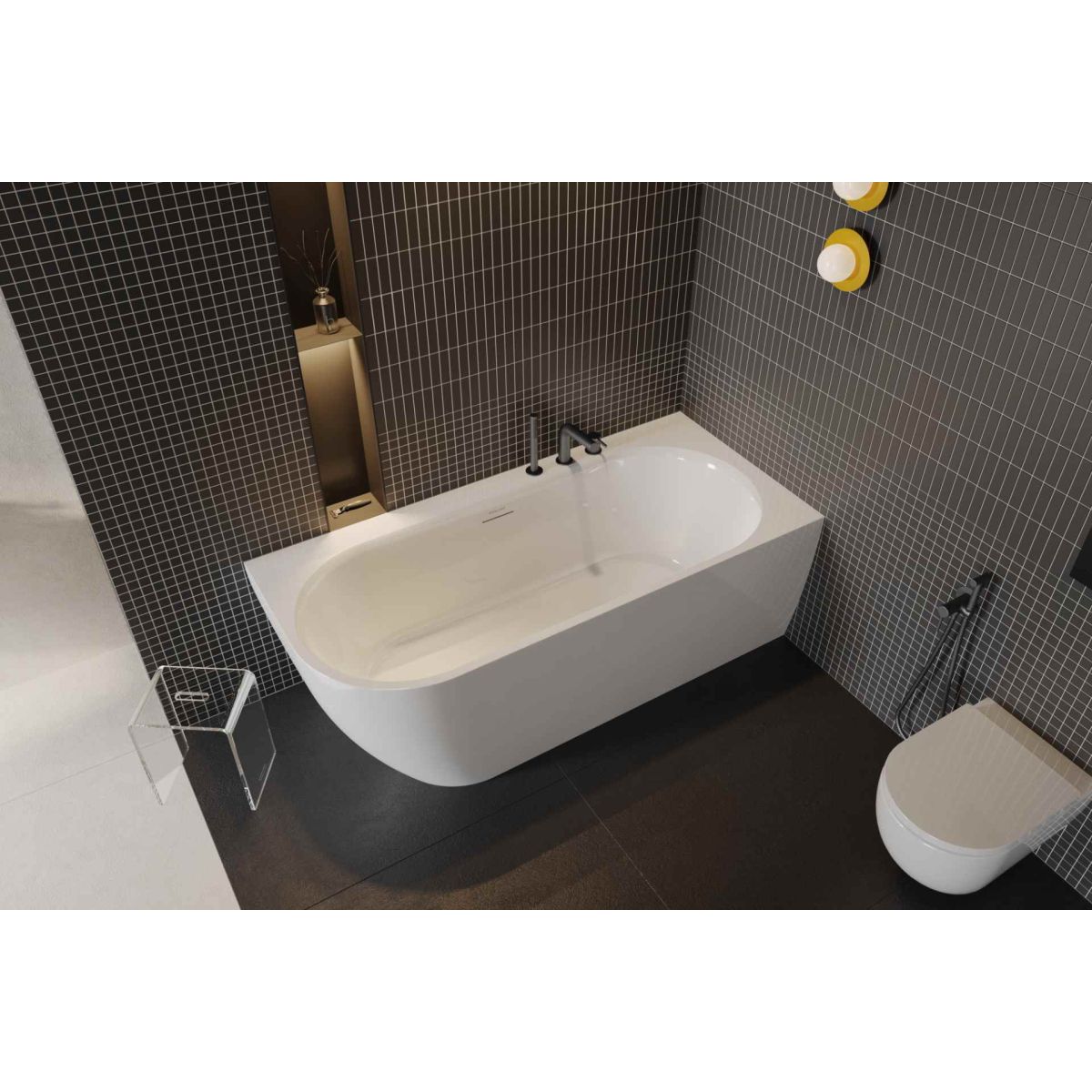Elle est fabriquée en acrylique 100% sanitaire. Elle est disponible en 3 versions : murale, angle droit et angle gauche. La baignoire avec corps intégré a un bord renforcé supplémentaire, ce qui permet d'installer un mitigeur de baignoire.