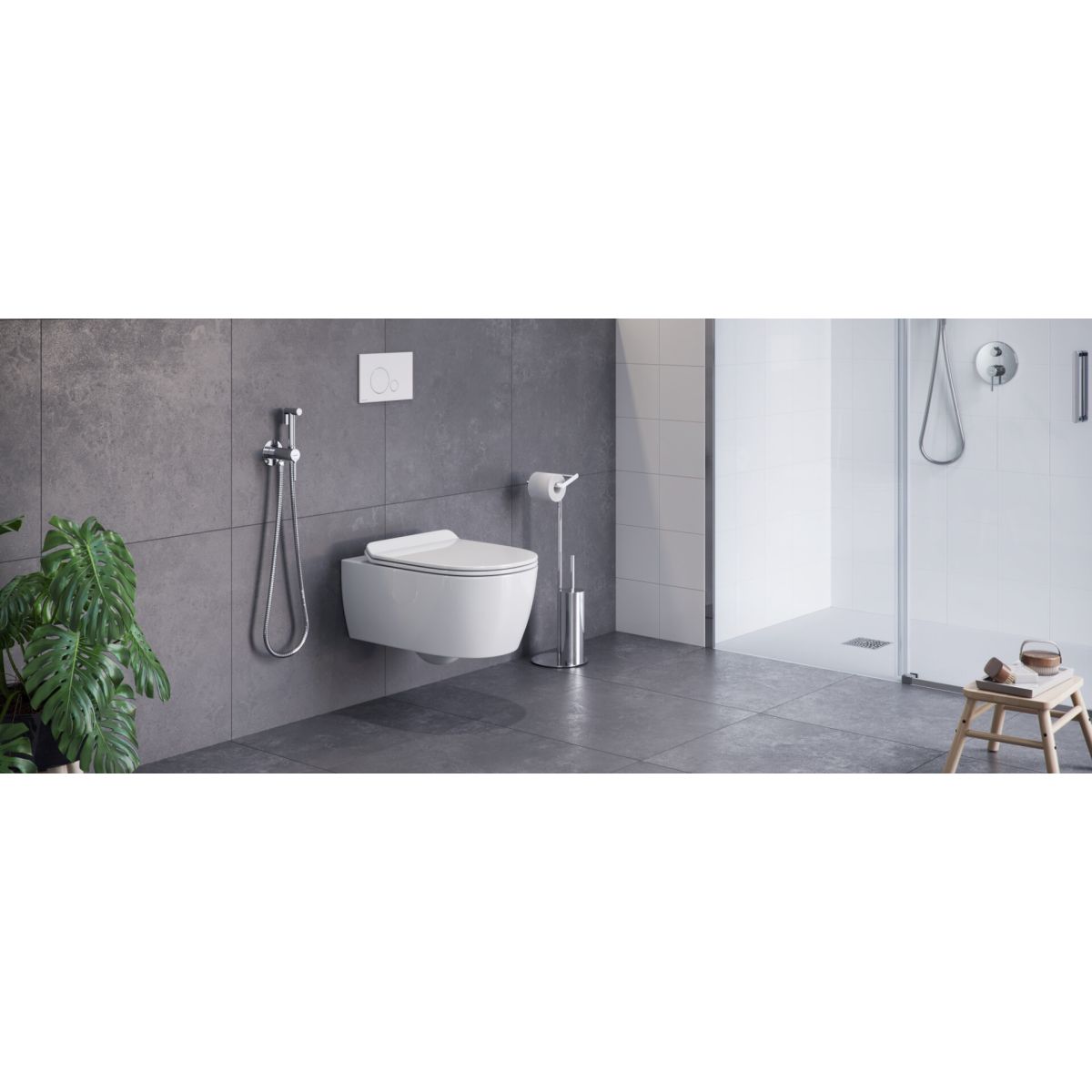 Le bouton a été conçu pour être aussi minimaliste que possible, de sorte que l'ensemble du boîtier ne dépasse que de 6 mm au-dessus du carrelage. Le modèle est disponible en trois couleurs : chrome, blanc brillant ou noir mat.
