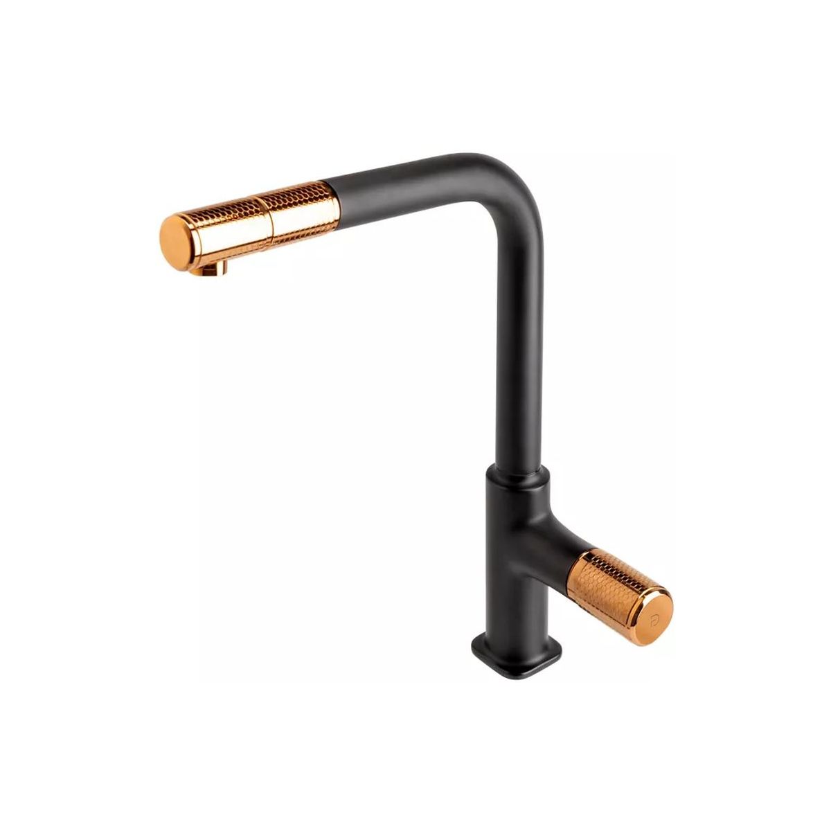 Le mitigeur de cuisine ARDESIA est un bon exemple de la tendance moderne du design des mitigeurs, qui se caractérise par une forme originale inspirée de la géométrie, des solutions fonctionnelles et une finition esthétique en noir mat avec des touches d'or rose. La poignée joystick permet de régler librement le débit souhaité et d'utiliser l'eau de manière efficace. Le bec pivotant et extractible à grande portée garantit le confort. Design et durable, il sera une décoration originale dans n'importe quelle cuisine, formant un duo harmonieux avec un évier en granit en graphite ou en graphite brillant, ainsi qu'avec un modèle en acier inoxydable.