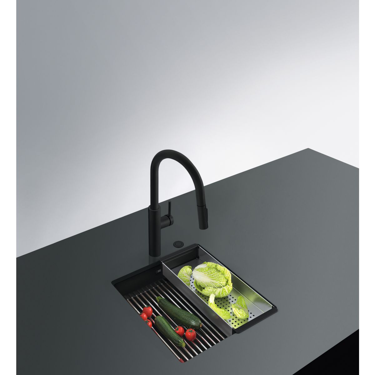- le kit comprend un égouttoir, un tapis en rouleau et un bouchon automatique Flow Pro, commandé par un bouton Easy Click, finition noir mat