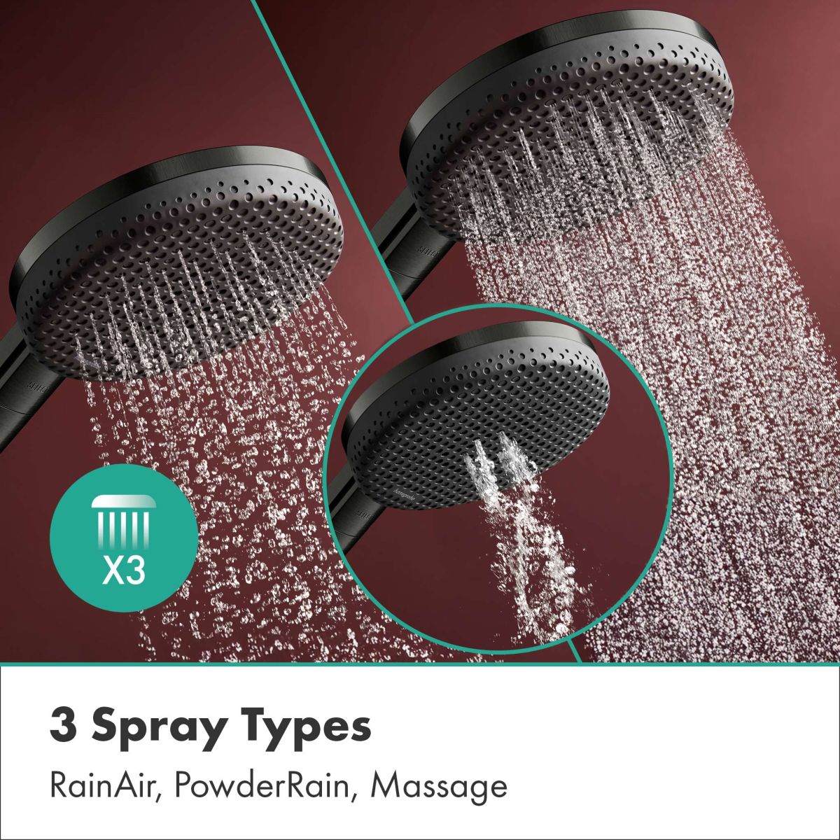 - La paire parfaite : cette douchette à main combine pour la première fois deux types de jets uniques hansgrohe RainAir et PowderRain en un seul. Elle est complétée par un jet de massage apaisant