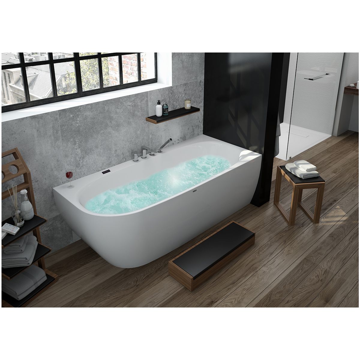 * baignoire d'angle droite complète comprenant : système de trop-plein intégré avec fonction de remplissage, système d'évacuation avec bouchon Klick-Klack, tuyau d'installation.