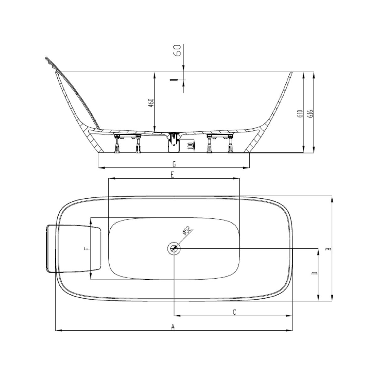 Baignoire ovale autoportante complète comprenant : système de trop-plein intégré, système d'évacuation avec bouchon Klick-Klack, tuyau de raccordement pour l'installation.
