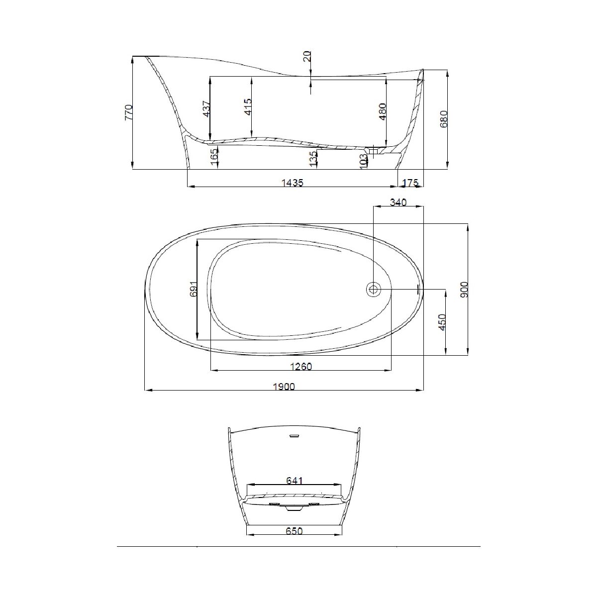 Baignoire ovale autoportante complète comprenant : système de trop-plein intégré, système d'évacuation avec bouchon Klick-Klack, tuyau de raccordement pour l'installation.