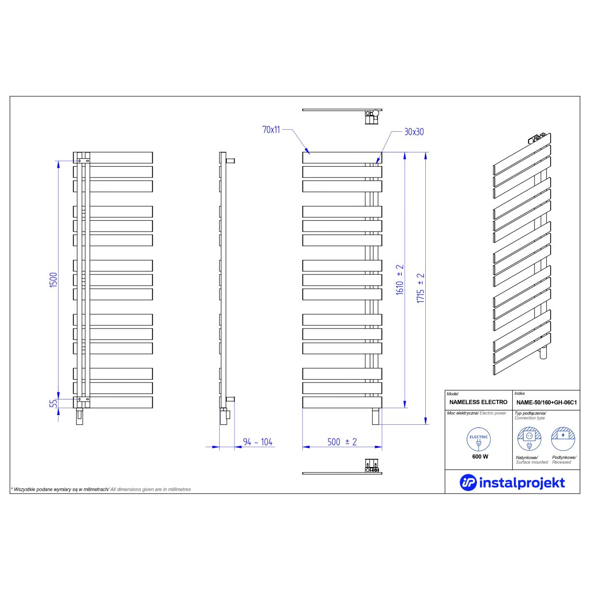 Grâce à un chauffage électrique de pointe, le radiateur fonctionne toute l'année et fournit de la chaleur exactement quand vous en avez besoin. Il fonctionne parfaitement avec le chauffage par le sol et le plafond, offrant un espace supplémentaire pour le séchage des textiles - idéal pour les maisons à pompe à chaleur. En outre, vous pouvez facilement exploiter l'énergie solaire grâce aux panneaux photovoltaïques. Pour répondre au mieux à vos besoins, des options de montage en surface ou encastré sont proposées. Un large choix de couleurs de radiateurs est également disponible, à la fois dans la palette Instal Projekt et dans la palette RAL. La beauté, c'est aussi la fonctionnalité, et Nameless Electro est un parfait exemple de cette combinaison.