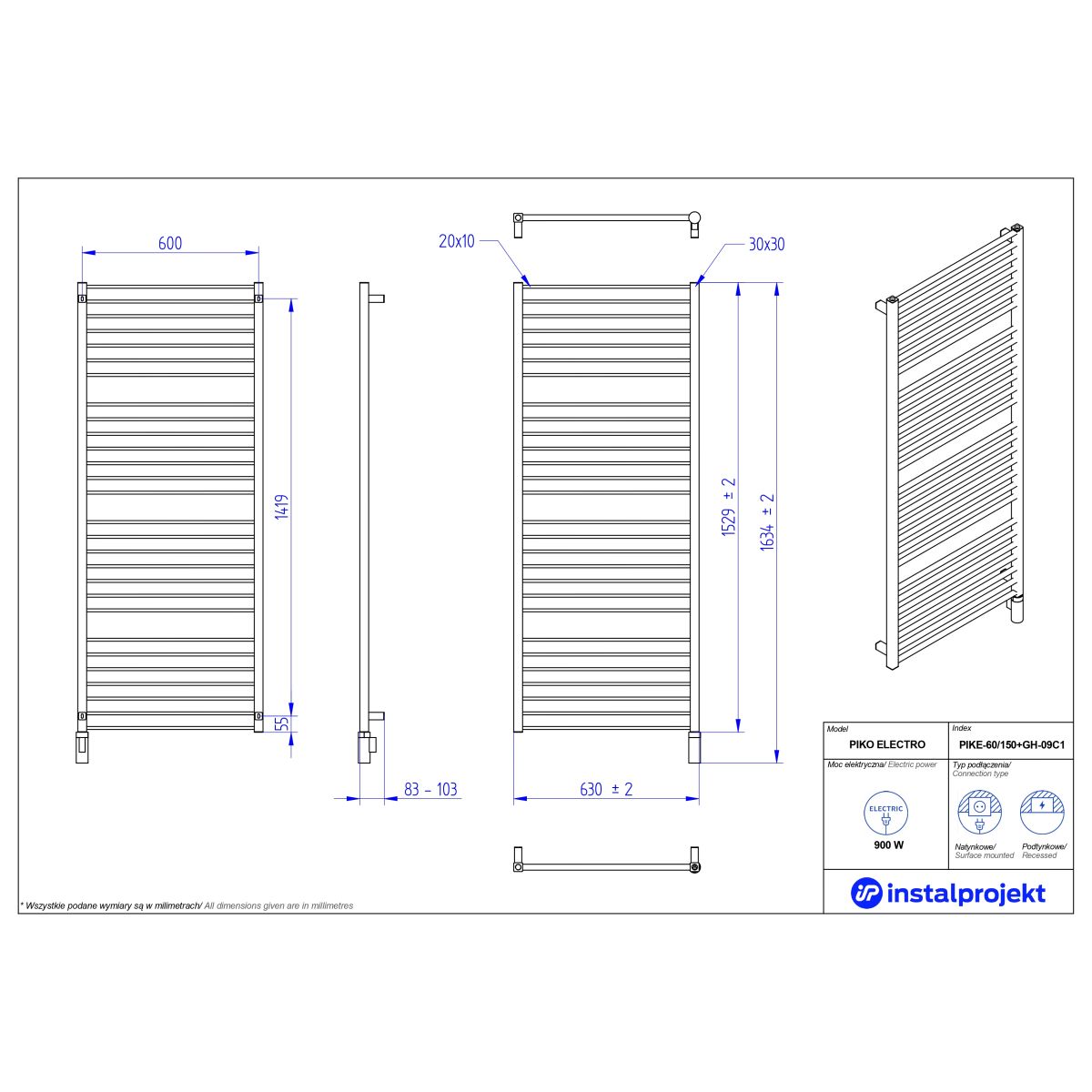 Instal Projekt Piko Electro radiateur électrique 152.9x63 cm blanc PIKE-60/150C34+GH-09C1