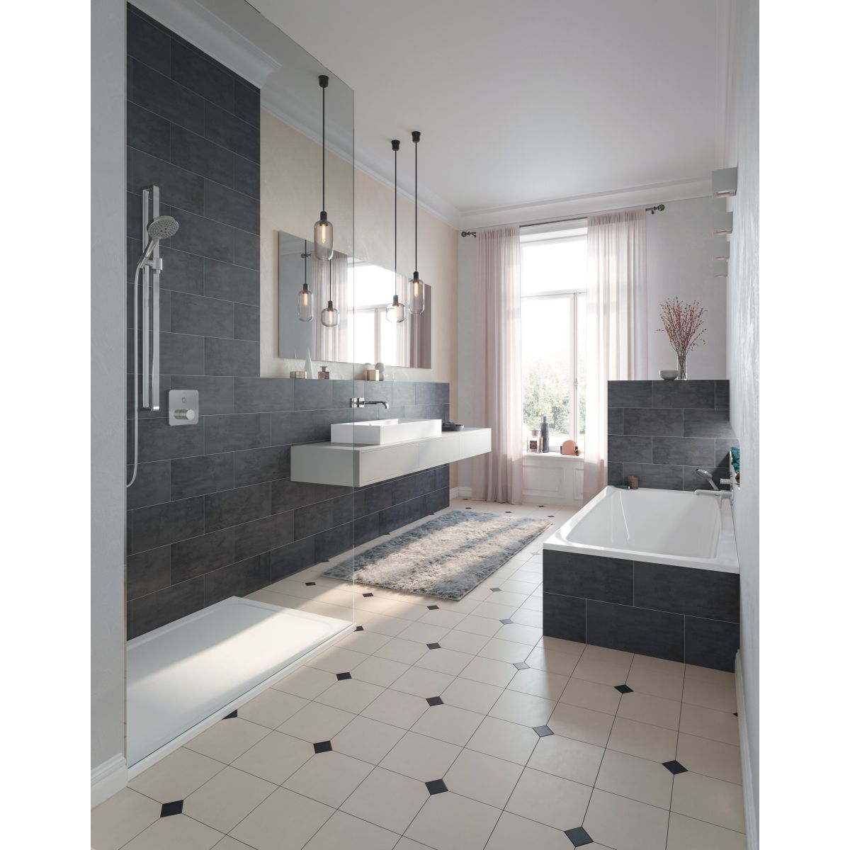 Receveur de douche plat de conception classique, avec écoulement situé au milieu du côté le plus court. Espace de repos spacieux et homogène. Parfaitement coordonné avec les produits de la famille Cayono.