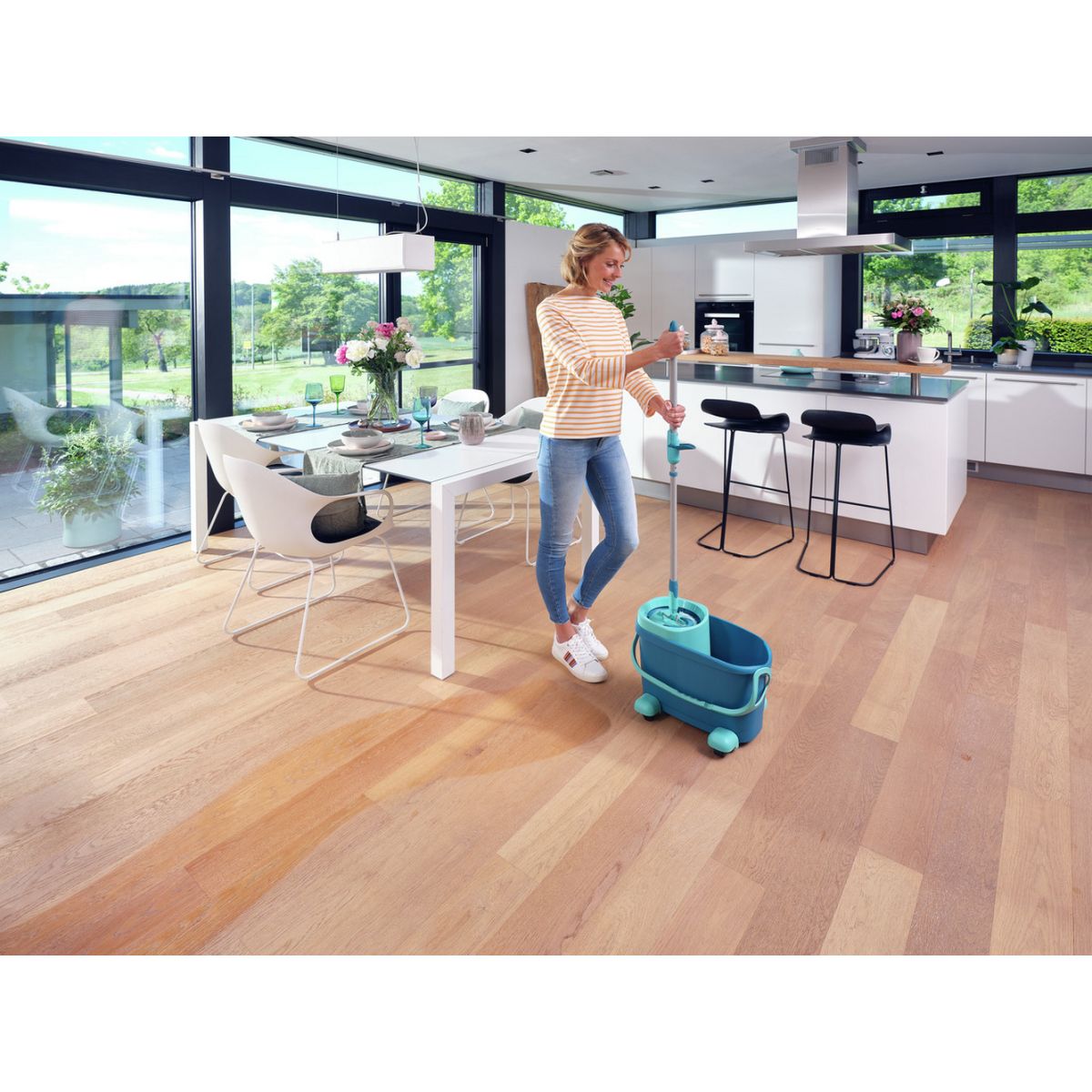 Avec l'ensemble Clean Twist M Ergo de Leifheit, vous pouvez nettoyer efficacement tous les sols sans vous salir les mains et en gagnant du temps, tandis que l'essorage de la serpillière est encore plus facile. Le manche et le seau sont fabriqués dans des matériaux durables et de haute qualité. Grâce au système breveté de centrifugation de la serpillière, vous pouvez adapter l'humidité de la serpillière à la surface à nettoyer et éliminer parfaitement l'excès d'eau et la saleté de la serpillière. De plus, il n'est pas nécessaire de se pencher pour le faire, le système de rotation est logé dans le manche, il suffit de retirer le mécanisme de verrouillage et d'appuyer pour faire tourner la serpillière. Le manche peut également être rallongé pour adapter sa longueur à la taille de la personne qui l'utilise. L'articulation pivotante à 360° permet de passer la serpillière en zigzag et d'accéder aux zones difficiles d'accès, et les roulettes incluses facilitent le transport du seau pendant le travail.