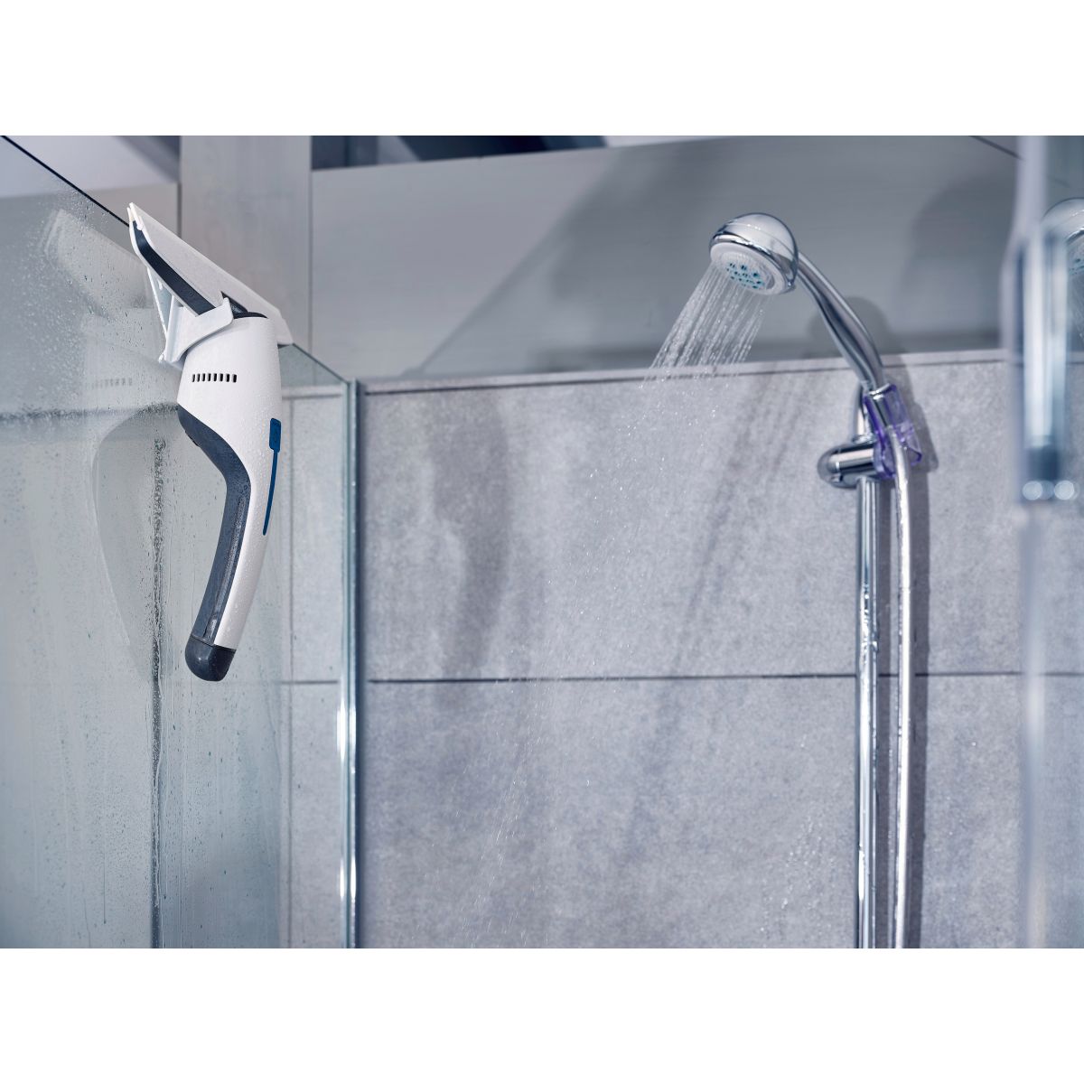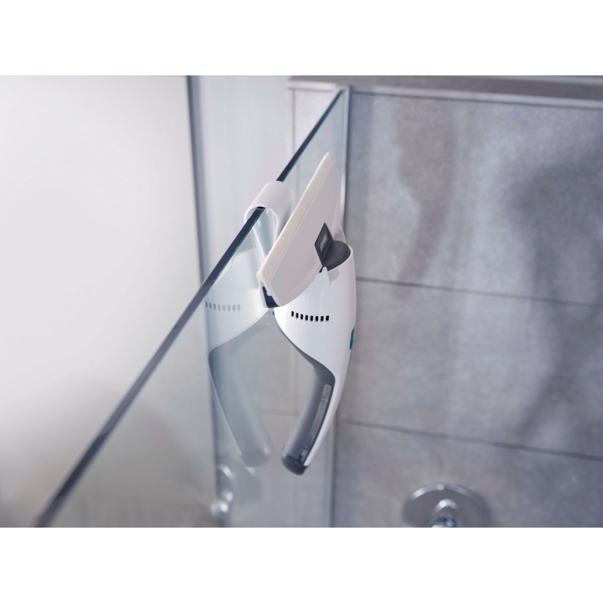 Le support extrêmement pratique pour le nettoyeur de vitres Nemo de Leifheit vous permet de ranger confortablement votre appareil inutilisé, tout en le gardant à portée de main. Le support est fabriqué en plastique robuste de couleur blanche. Il peut être fixé au mur à l'aide de vis (non fournies) ou accroché au mur de la cabine de douche à l'aide d'un clip. Cela est possible et sûr, car le modèle Nemo répond à la norme d'étanchéité IPX7 et peut donc être rangé dans la douche, par exemple.