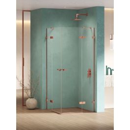 Le modèle Eventa Copper Shine présente d'élégants détails en cuivre avec une finition brillante. La porte encastrée est en verre de sécurité trempé de 8 mm d'épaisseur avec revêtement Active Shield. Une gouttière située au bas de la porte permet d'évacuer l'eau du verre vers l'espace douche. Le produit peut être installé avec ou sans receveur de douche.
