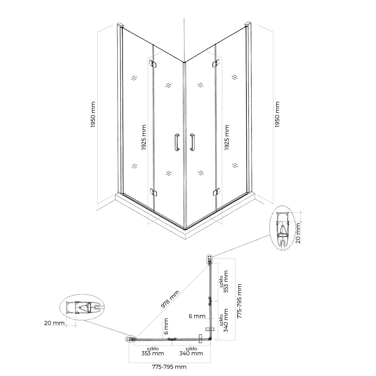 Les dimensions indiquées dans les diagrammes sont les dimensions de la cabine mesurées de l'intérieur (à partir du coin) à l'extrémité du profilé de la cabine (et non au centre du verre).