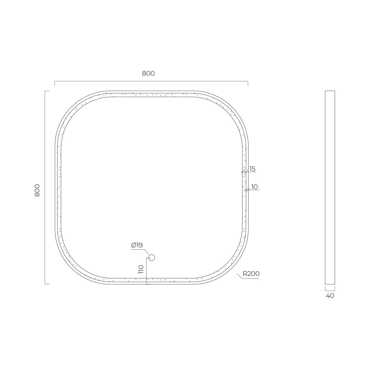 - éclairage sous forme d'une bande de 1,5 cm de large sur la face avant du miroir