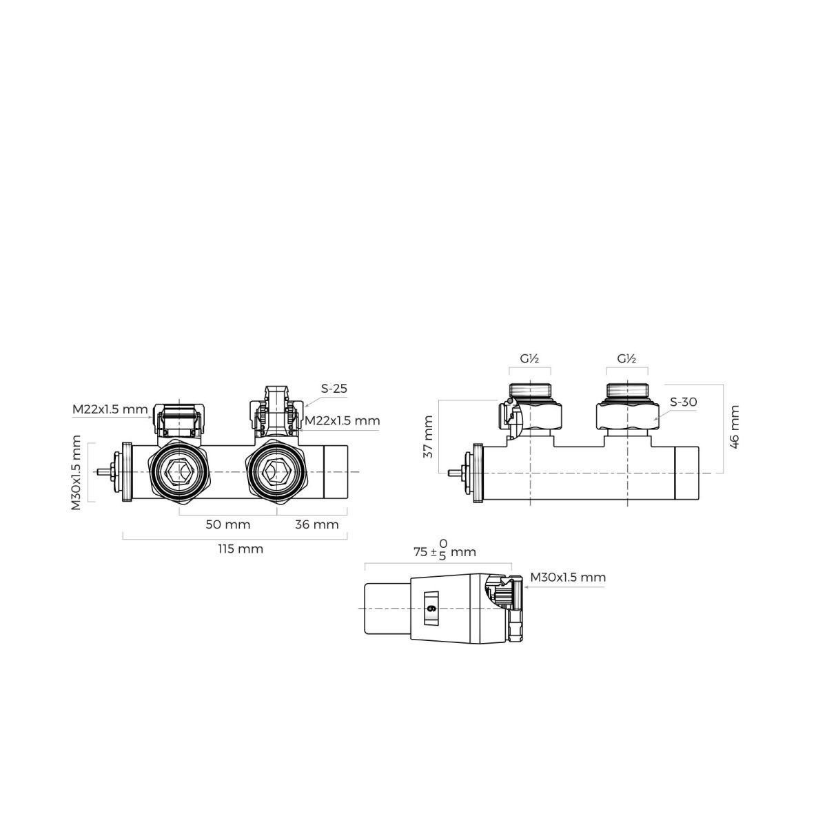 Ensemble complet de vannes pour le montage d'un radiateur avec raccordement central à 50 mm d'entraxe, comprenant un bloc de raccordement avec vanne thermostatique intégrée, une vanne d'arrêt et une tête thermostatique. Adapté à la fois pour une installation dans des systèmes de chauffage central réalisés avec des tuyaux en cuivre 15x1 et en plastique PEX/AluPEX 16x2. Tous les éléments du kit sont de couleur assortie aux radiateurs de la marque Oltens.