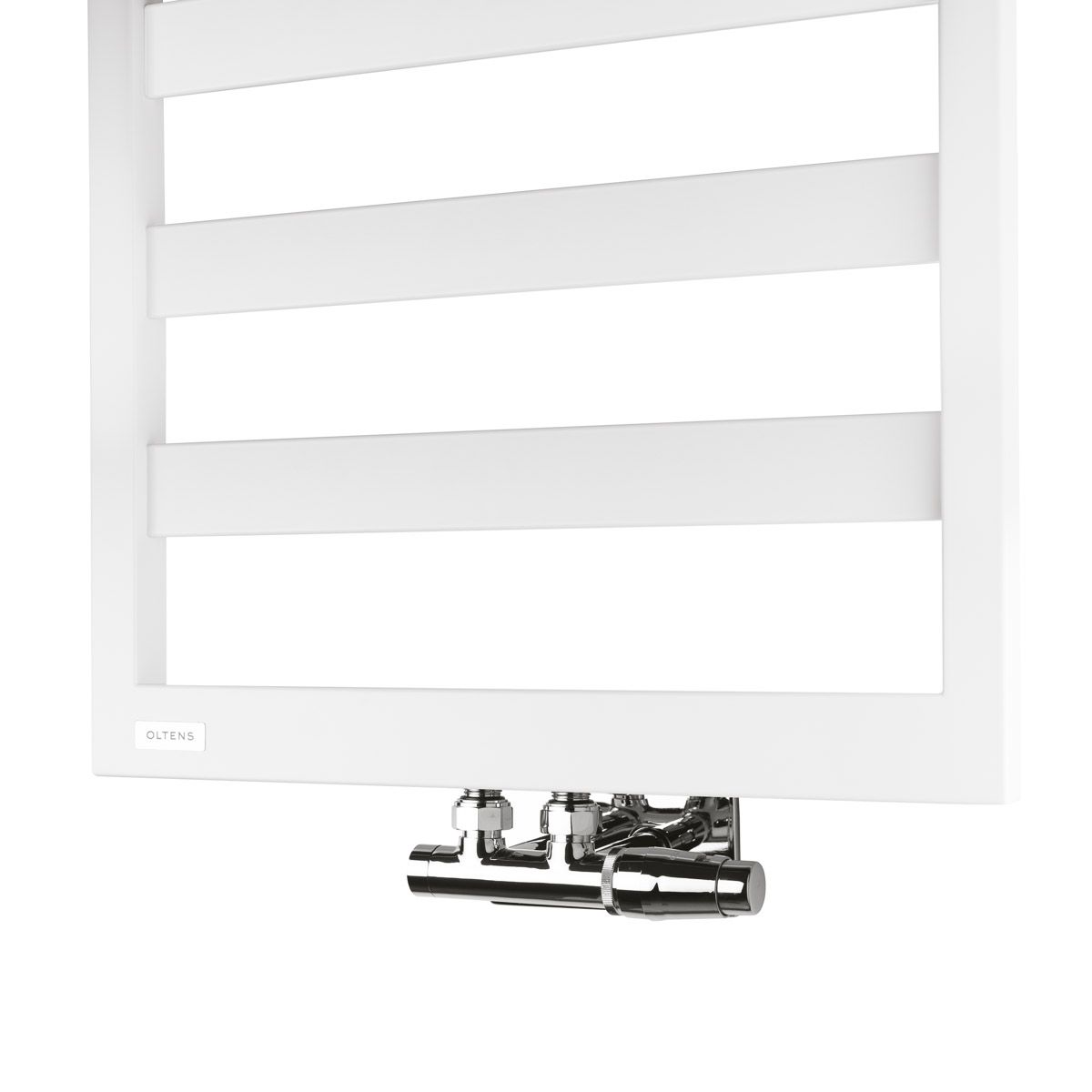 Ensemble complet de vannes pour le montage d'un radiateur avec raccordement central à 50 mm d'entraxe, comprenant un bloc de raccordement avec vanne thermostatique intégrée, une vanne d'arrêt et d'une tête thermostatique. Adapté à la fois pour une installation dans des systèmes de chauffage central réalisés avec des tuyaux en cuivre 15x1 et en plastique PEX/AluPEX 16x2. Tous les éléments du kit sont de la même couleur que les radiateurs de la marque Oltens.