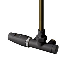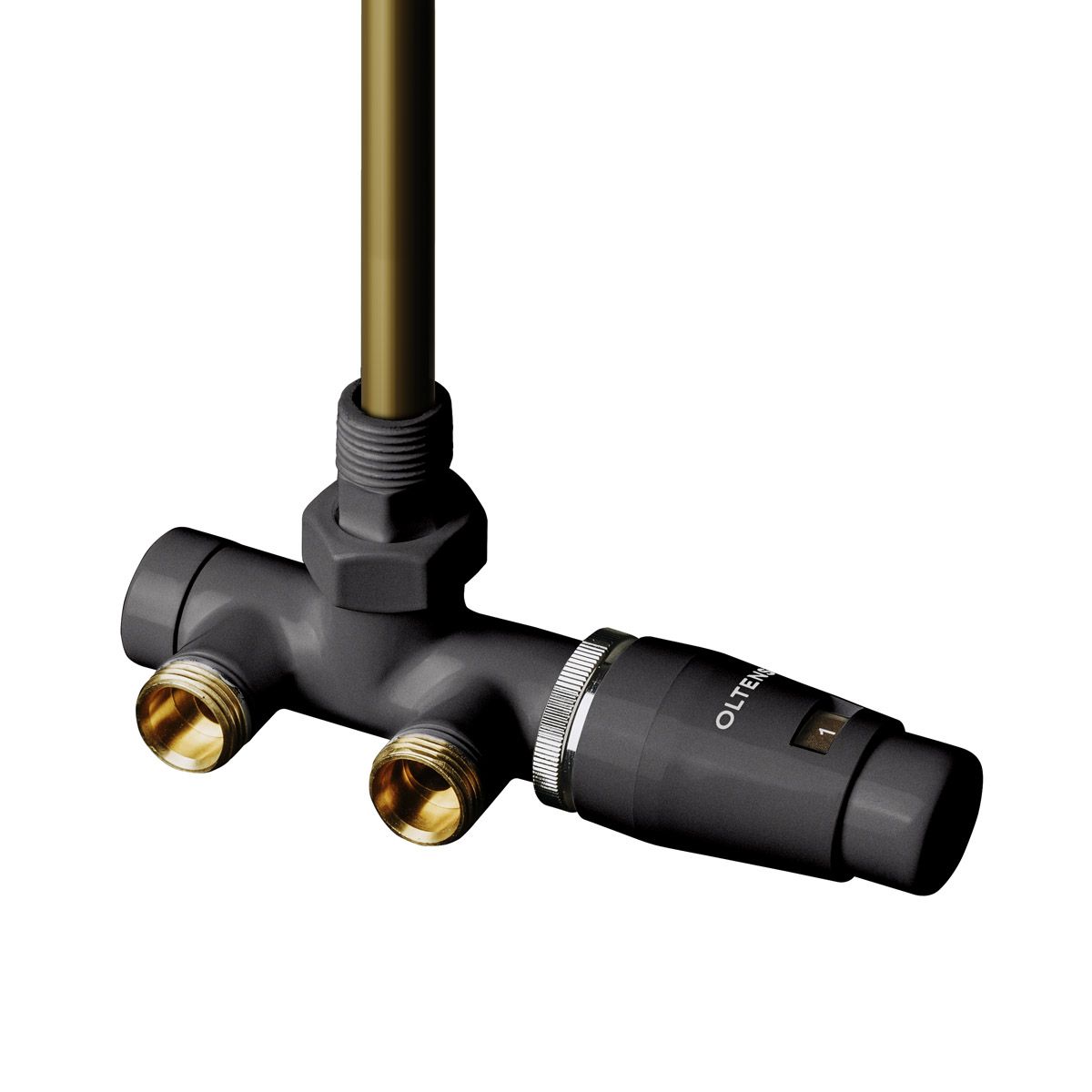 Le kit de raccordement monotrou se compose d'une vanne combinée comprenant un robinet thermostatique et une vanne d'arrêt, d'une tête thermostatique de marque Oltens montée sur le corps de la vanne et d'un tuyau collecteur de 30 cm.