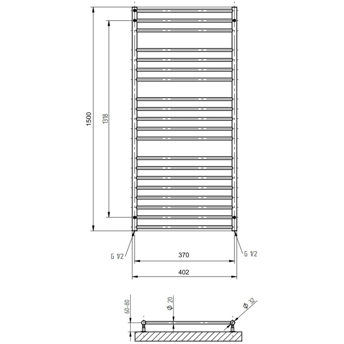 - diamètre des collecteurs verticaux : ø 32 mm