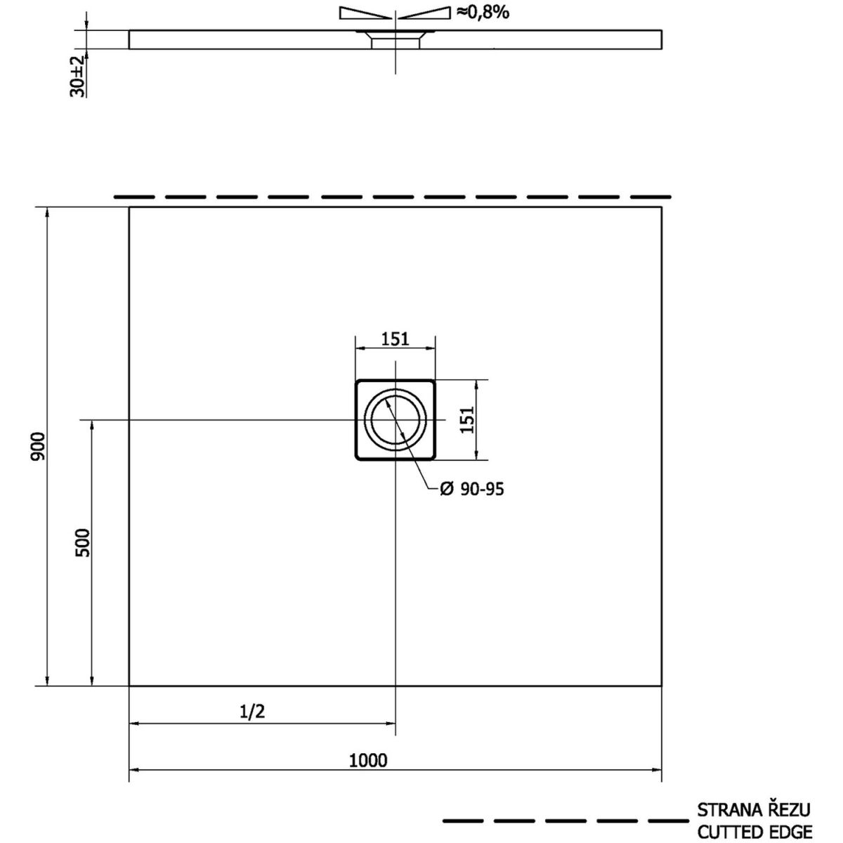 - un côté du receveur de douche est découpé sur mesure (non fini - voir schéma), le receveur de douche doit être placé de manière à ce que le côté marqué ne soit pas visible