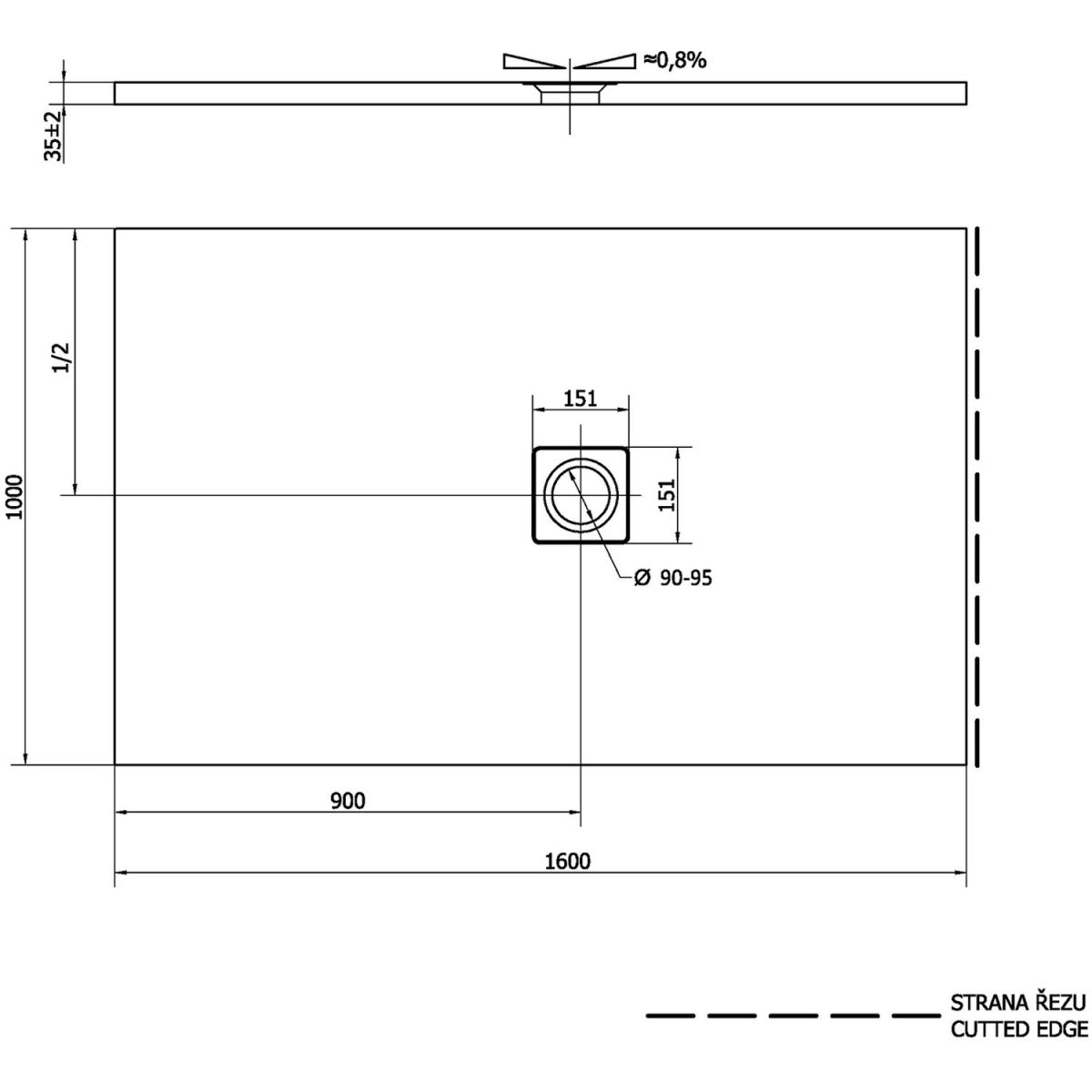 - un côté du receveur de douche est coupé sur mesure (non fini - voir schéma), le receveur de douche doit être placé de manière à ce que le côté marqué ne soit pas visible