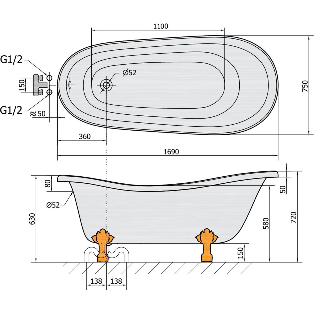 - l'utilisation d'un kit spécial de trop-plein de baignoire est nécessaire (vendu séparément)