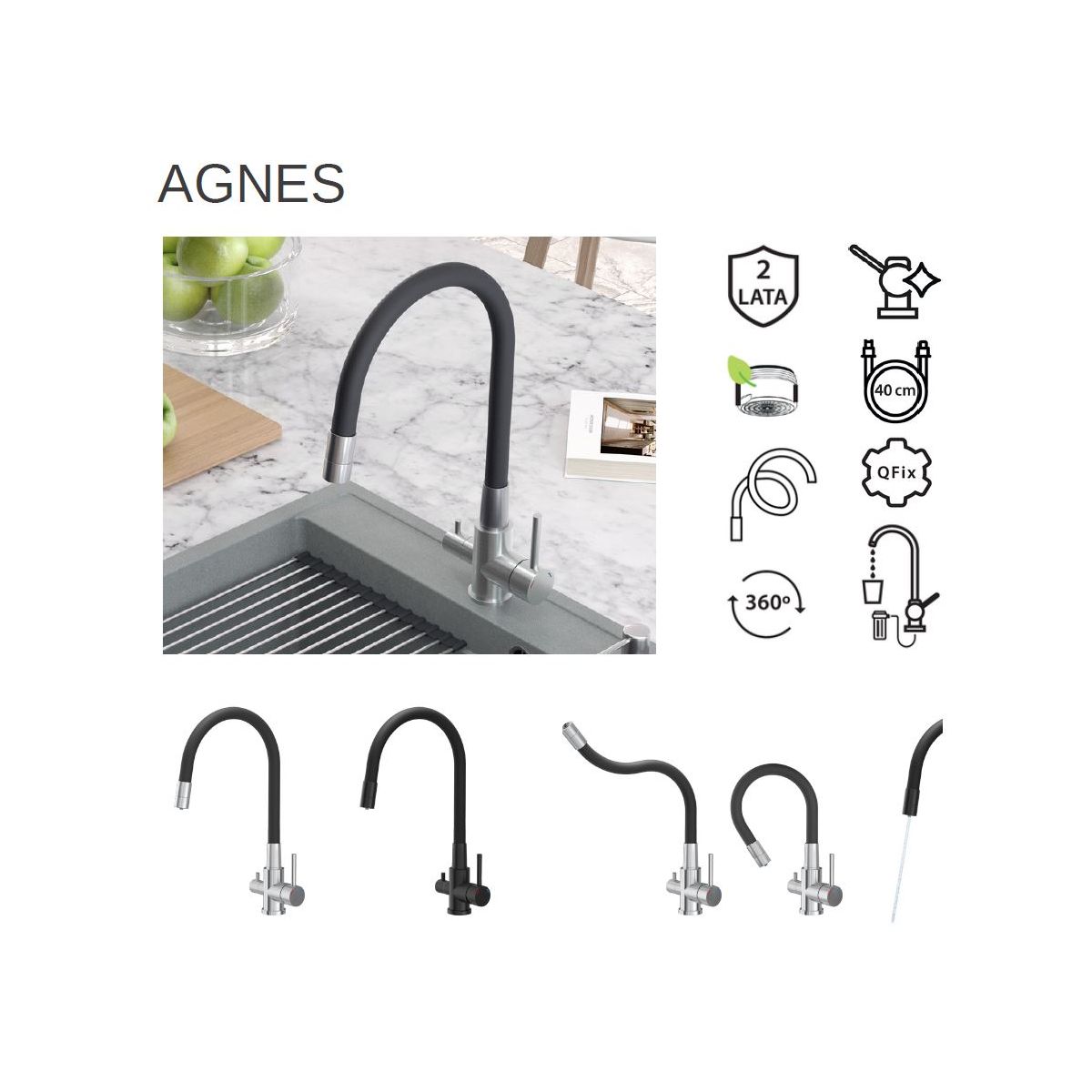 AGNES est un mitigeur de cuisine moderne et fonctionnel. Il est équipé d'un bec flexible qui permet de diriger le flux d'eau exactement là où nous en avons besoin. Nous pouvons ainsi rincer facilement la vaisselle en cours de lavage ou la cuvette de l'évier. Le bec flexible est fabriqué en plastique de haute qualité, ce qui nous permet de profiter longtemps de sa fonctionnalité et de sa fiabilité.