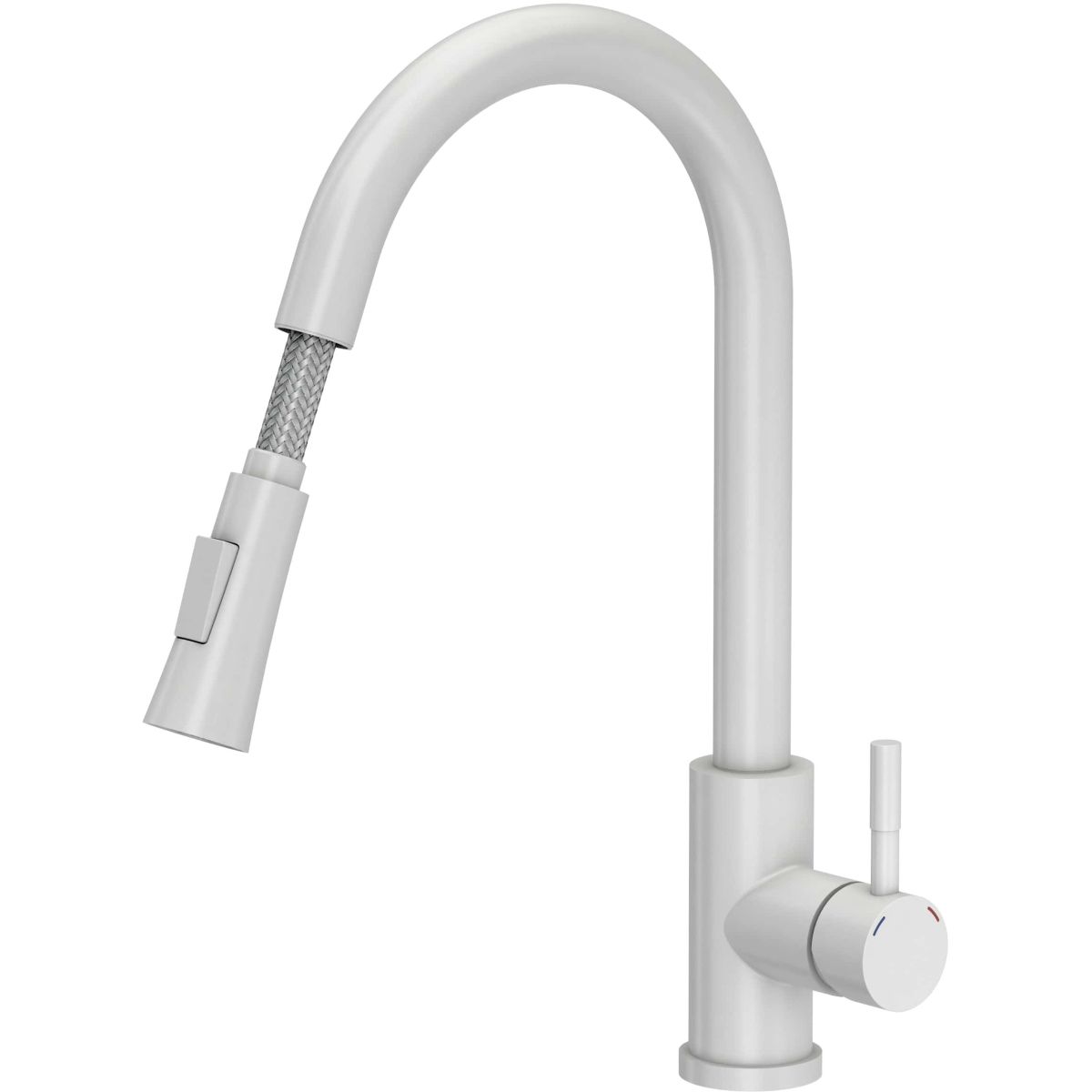 - mitigeur en acier blanc hauteur 42,5 cm avec douchette extractible et interrupteur pour la fonction douche (mitigeur avec système d'assemblage QFix, c.-à-d. écrou sans outils supplémentaires)