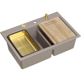 MARC 120 WORKSTATION GraniteQ Évier 2 cuves 760*500*235 mm taupe doux + siphon push to open + distributeur + planche + insert / éléments dorés