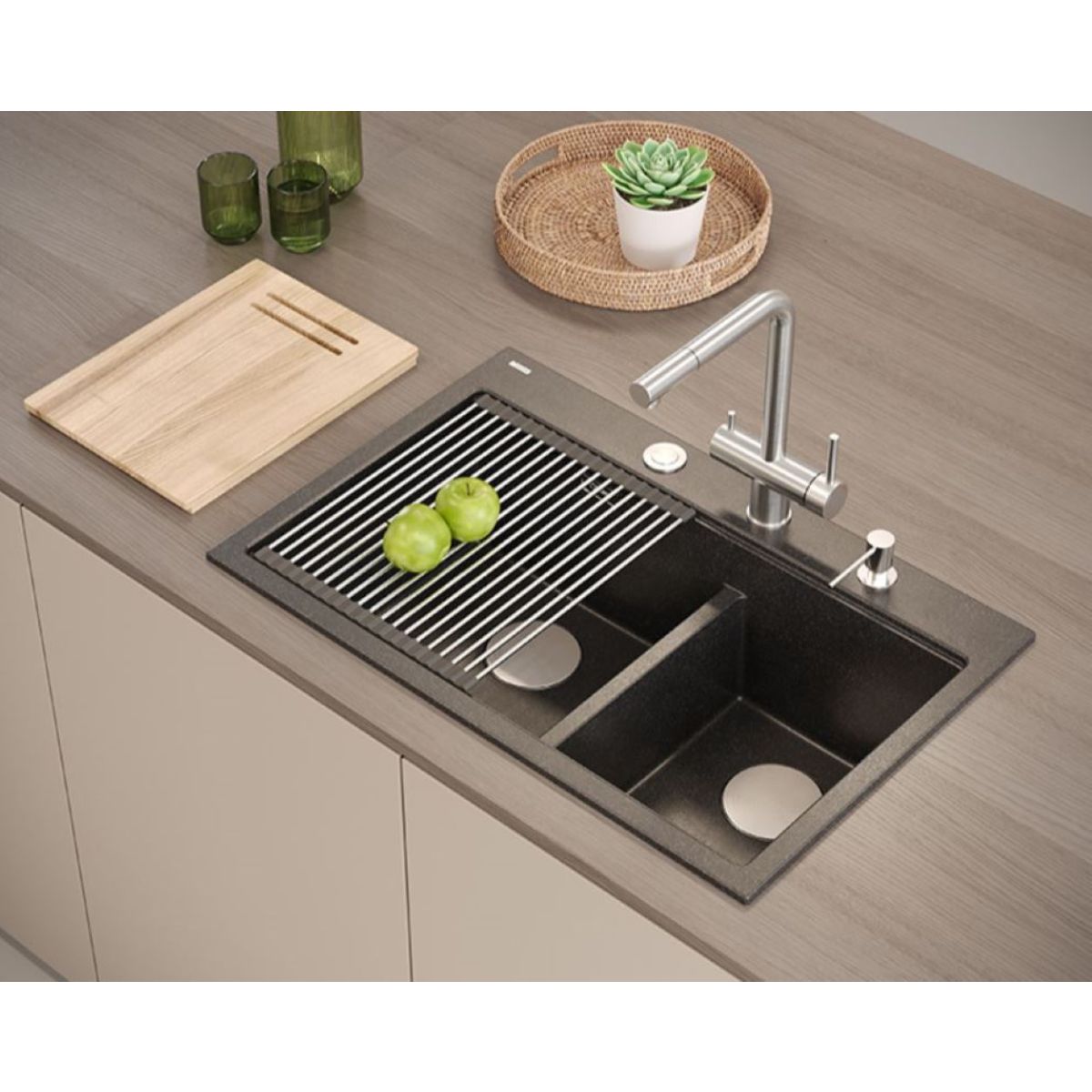 Le Marc 120 Workstation GraniteQ est un évier double diamant noir qui allie élégance et style à une fonctionnalité exceptionnelle. Idéal pour un usage intensif, il répondra aux attentes des utilisateurs les plus exigeants en offrant une série d'avantages qui rendront le travail quotidien en cuisine plus efficace et plus confortable.