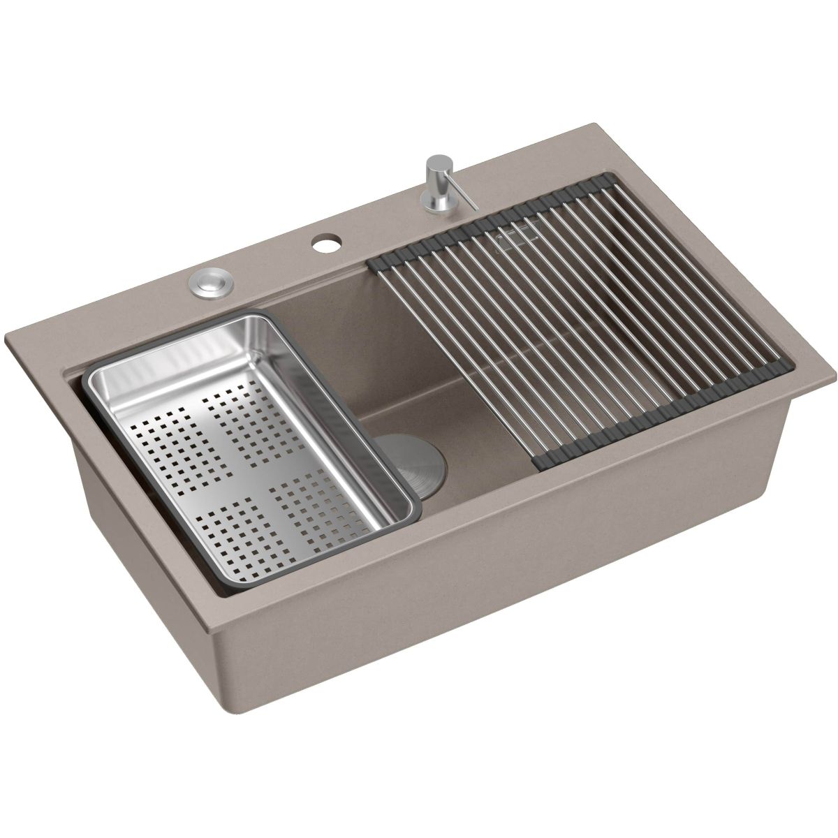 Marc Workstation GraniteQ - est une collection destinée aux utilisateurs qui attendent une grande fonctionnalité de leur évier. Dans le cas de ce modèle, grâce à la cuve extra-large de 61 litres, même les grandes plaques de four peuvent être rincées et lavées confortablement.
