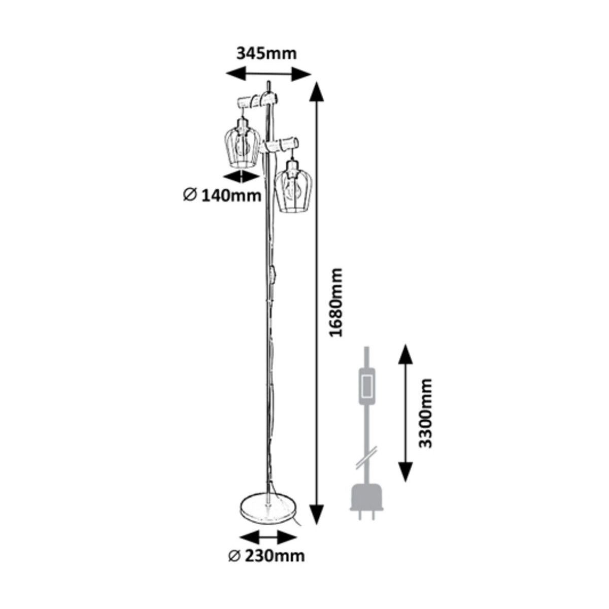 La lampe sur pied Fabian de style industriel sera un accessoire et une décoration uniques pour votre salon ou votre chambre à coucher. Ce modèle, composé d'un cadre noir mat et d'abat-jours rayés de la même couleur, est fabriqué en métal et en bois et est complété par une base décorative circulaire. Le câble de la lampe est acheminé à l'intérieur du socle et, caché, il atteint les têtes de lampe à travers celui-ci, ce qui confère à ce modèle un aspect distinctif et austère. La lumière circule librement sous les abat-jour en forme de cage suspendus vers le bas. Le modèle Fabian peut être utilisé avec deux lampes à incandescence d'une puissance maximale de 40 W chacune. La lampe est équipée de douilles de type E27. Si vous souhaitez créer une atmosphère chaleureuse et intime dans la pièce, choisissez des ampoules émettant une lumière blanche et chaude pour cette lampe. L'interrupteur de la lampe Fabian se trouve sur le câble électrique. La longueur du câble est de 330 cm. Les dimensions de la lampe sont les suivantes 34.5 cm de large, 168 cm de haut, le diamètre de chaque abat-jour est de 14 cm. Ce modèle est fourni sans sources lumineuses.